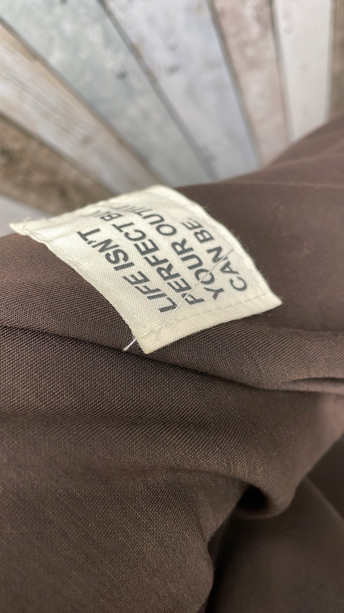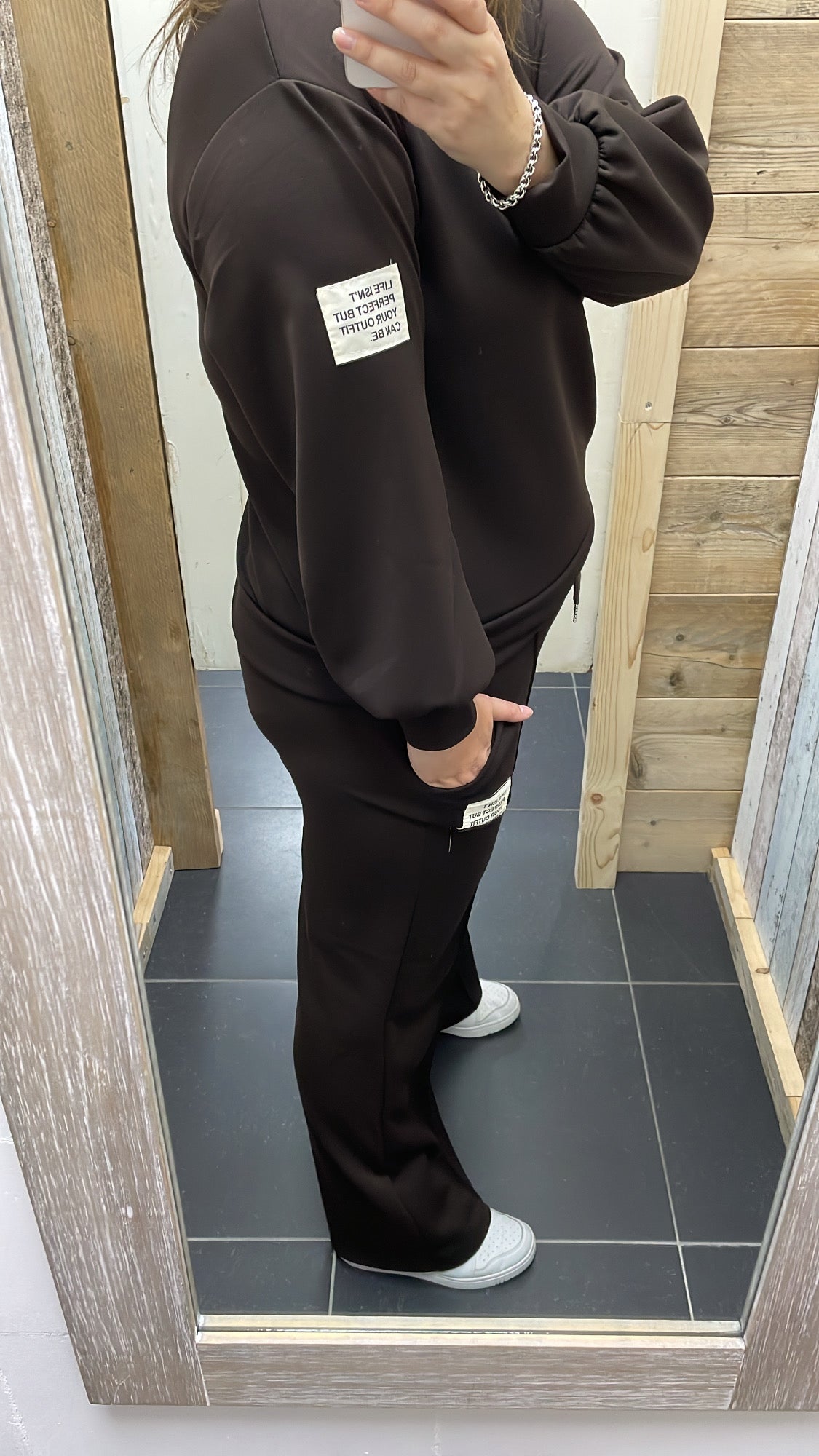 Op zowel de trui als de broek staat een embleem met de tekst 'Life isn't perfect but your outfit can be'