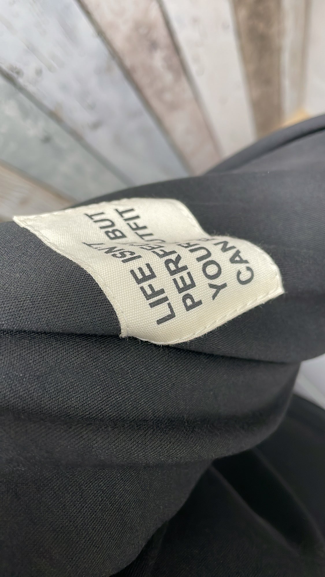 Op zowel de trui als de broek staat een embleem met de tekst 'Life isn't perfect but your outfit can be'