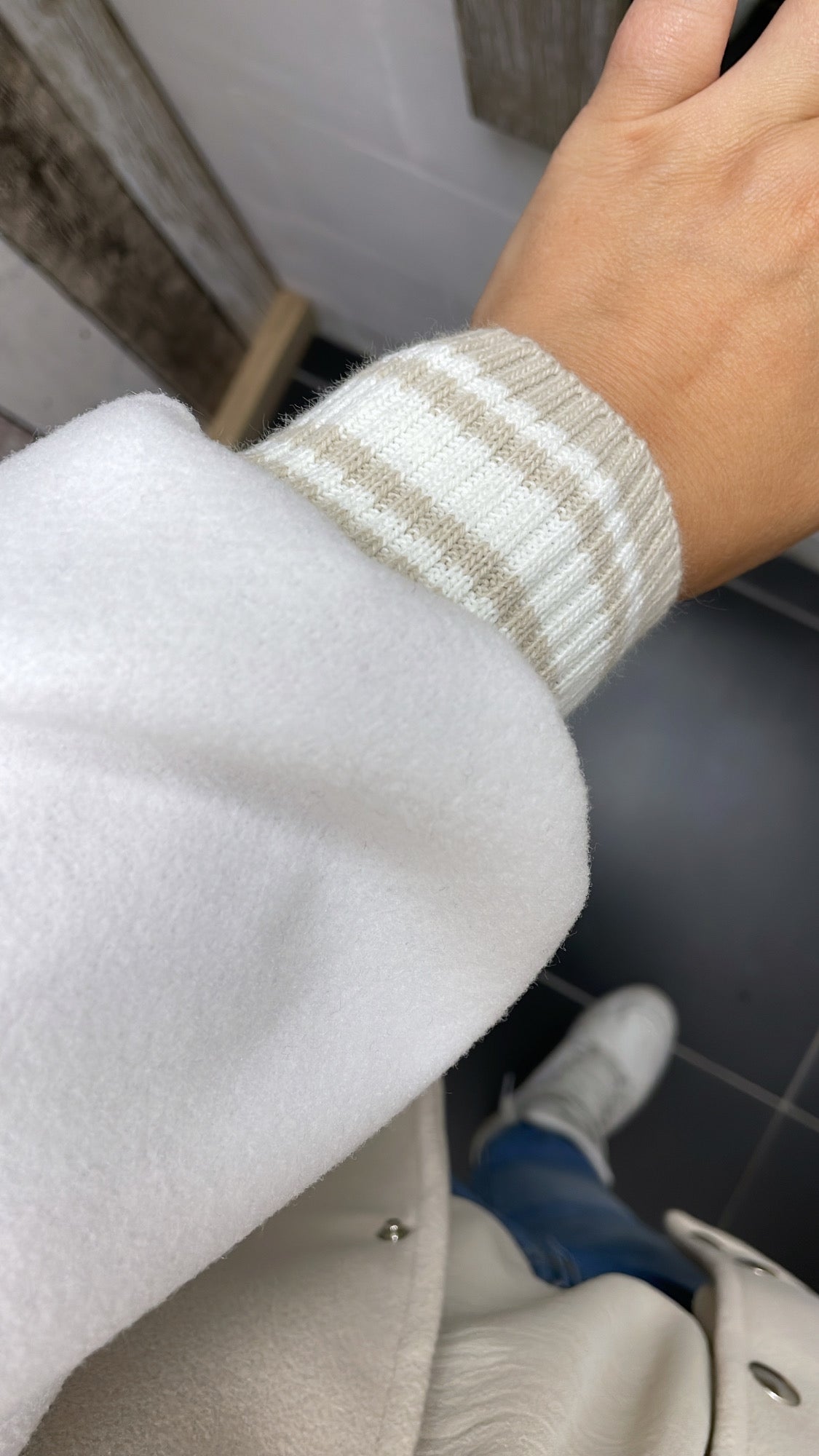 Het jacket heeft lange mouwen en op het uiteinde - de kraag en aan de onderkant zit een zwart/wit bies.