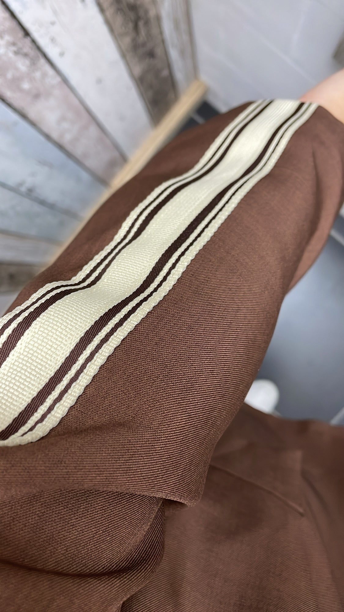 Op de mouw zit een (beige) bies en loopt door van de schouder tot aan de pols.