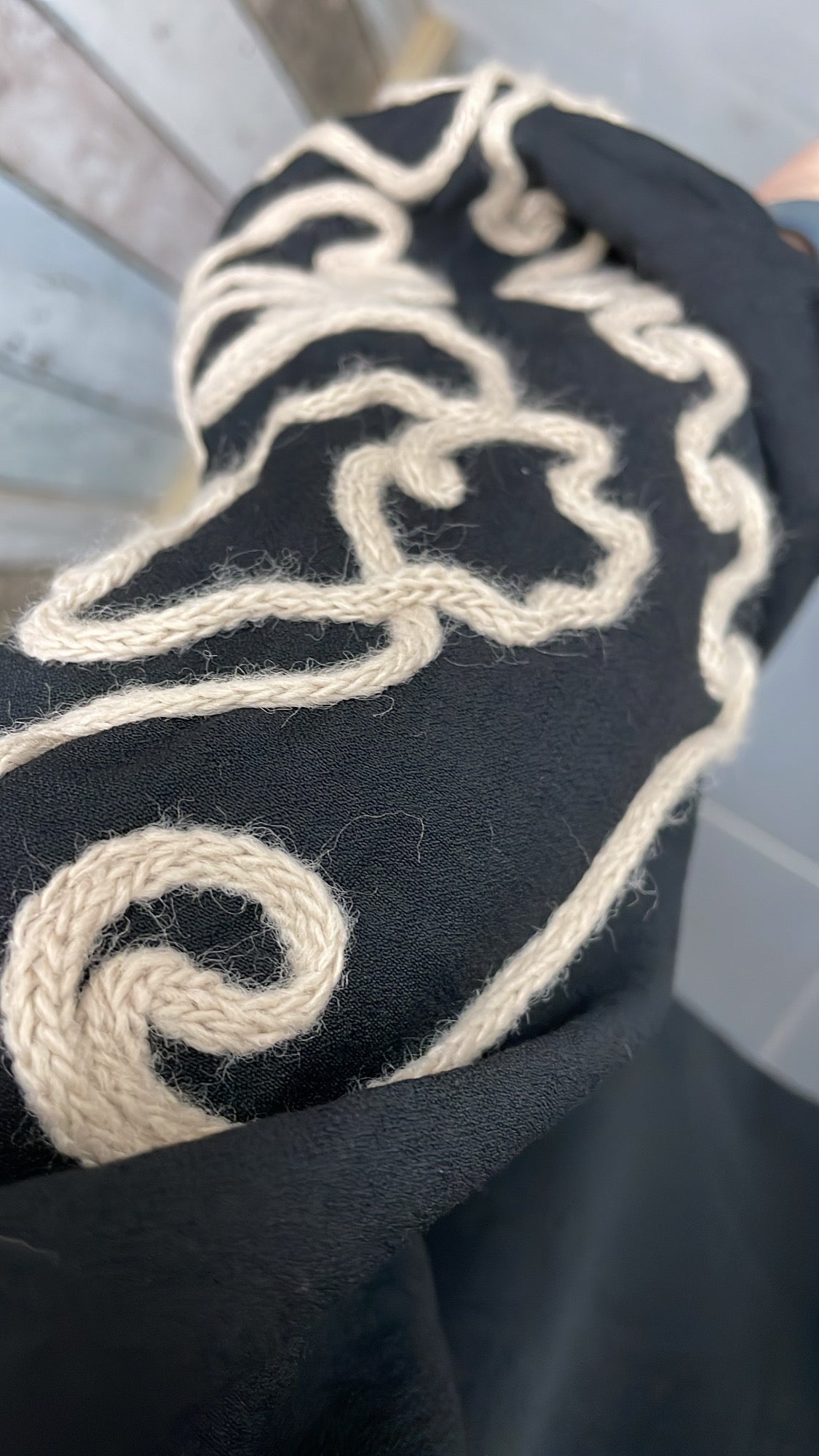 Op de mouw zit een (touw) borduursel gestikt. let op: we hebben 2 soorten stiksels.