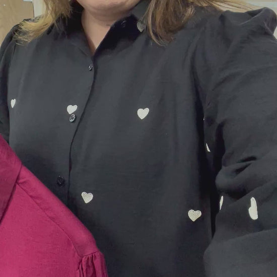 De achterkant van de blouse valt een stuk langer en ruim over de billen.
