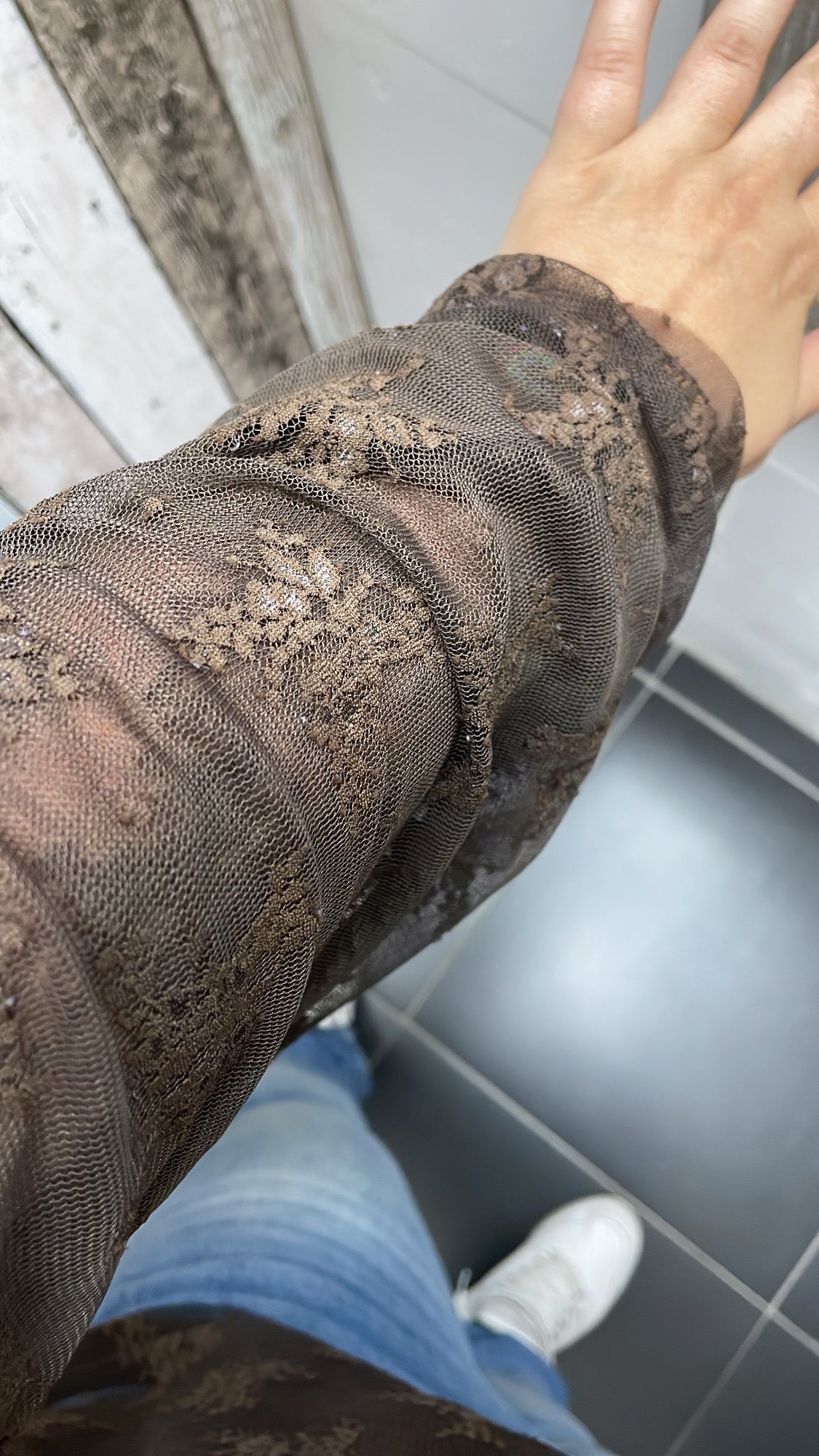 De blouse heeft kanten mouwen en die zijn doorschijnend.