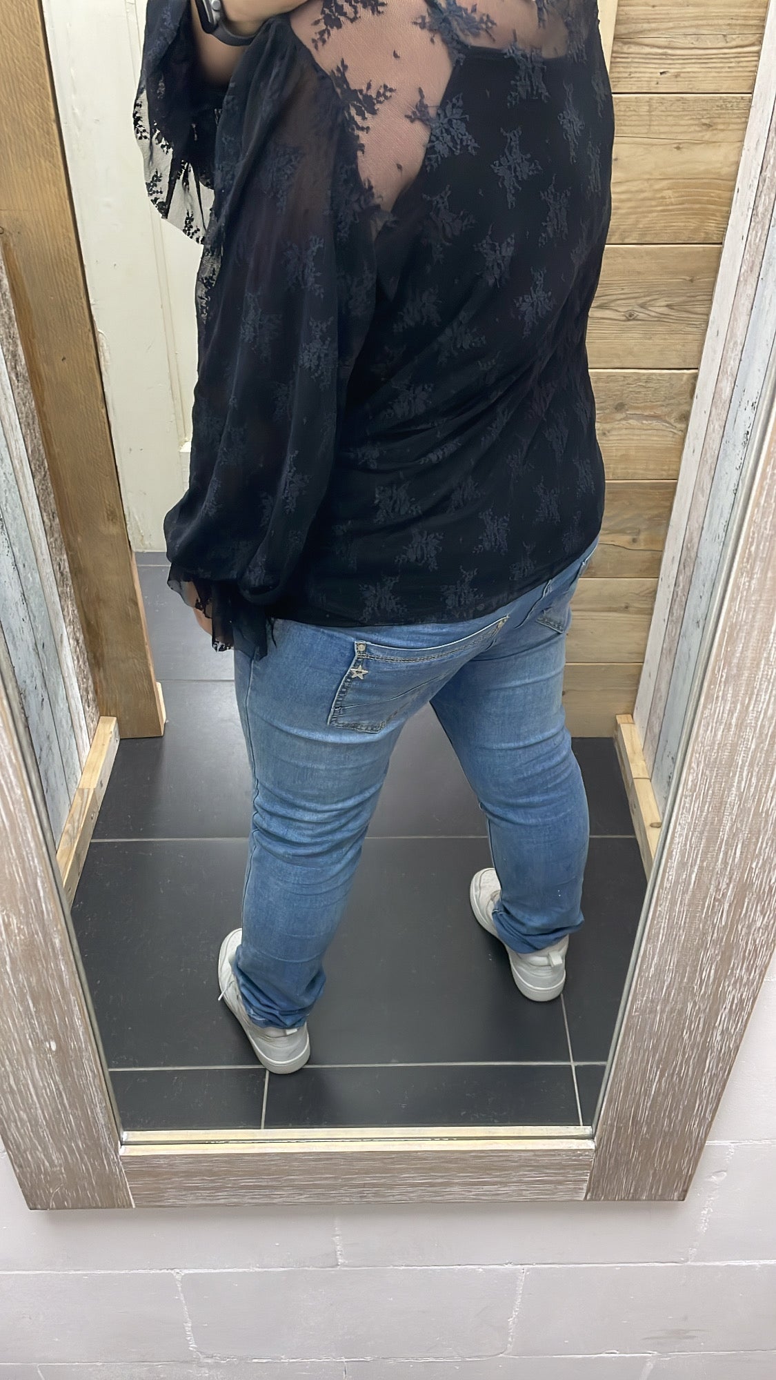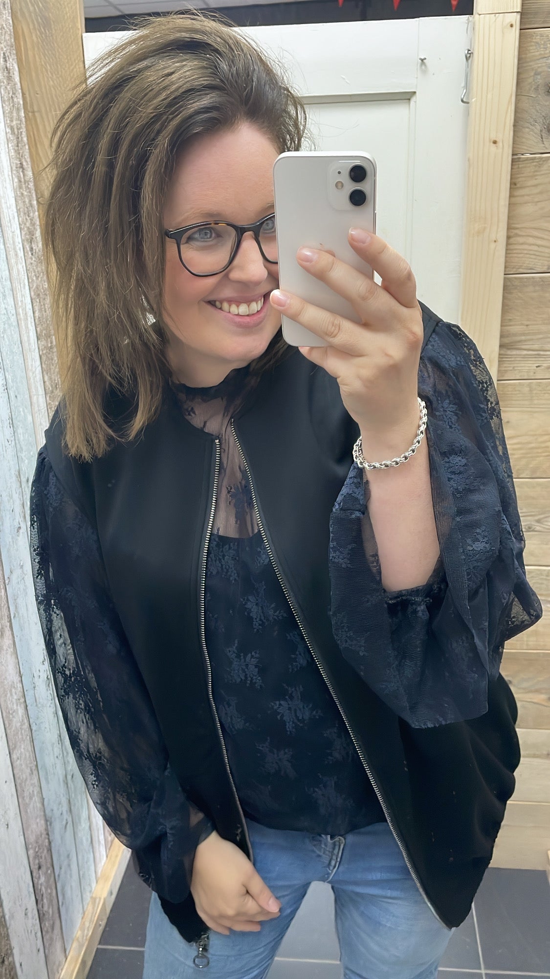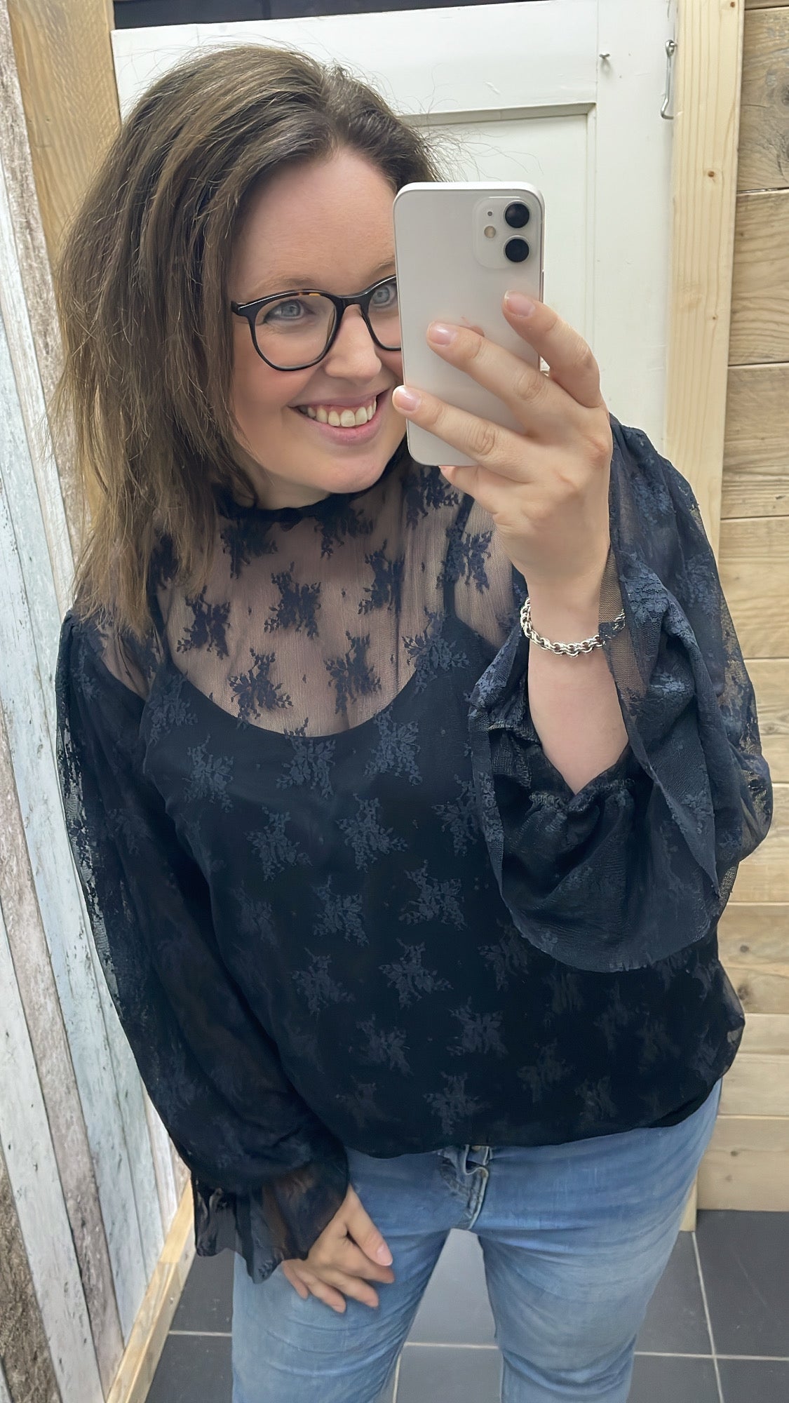 De blouse heeft kanten mouwen en die zijn doorschijnend.