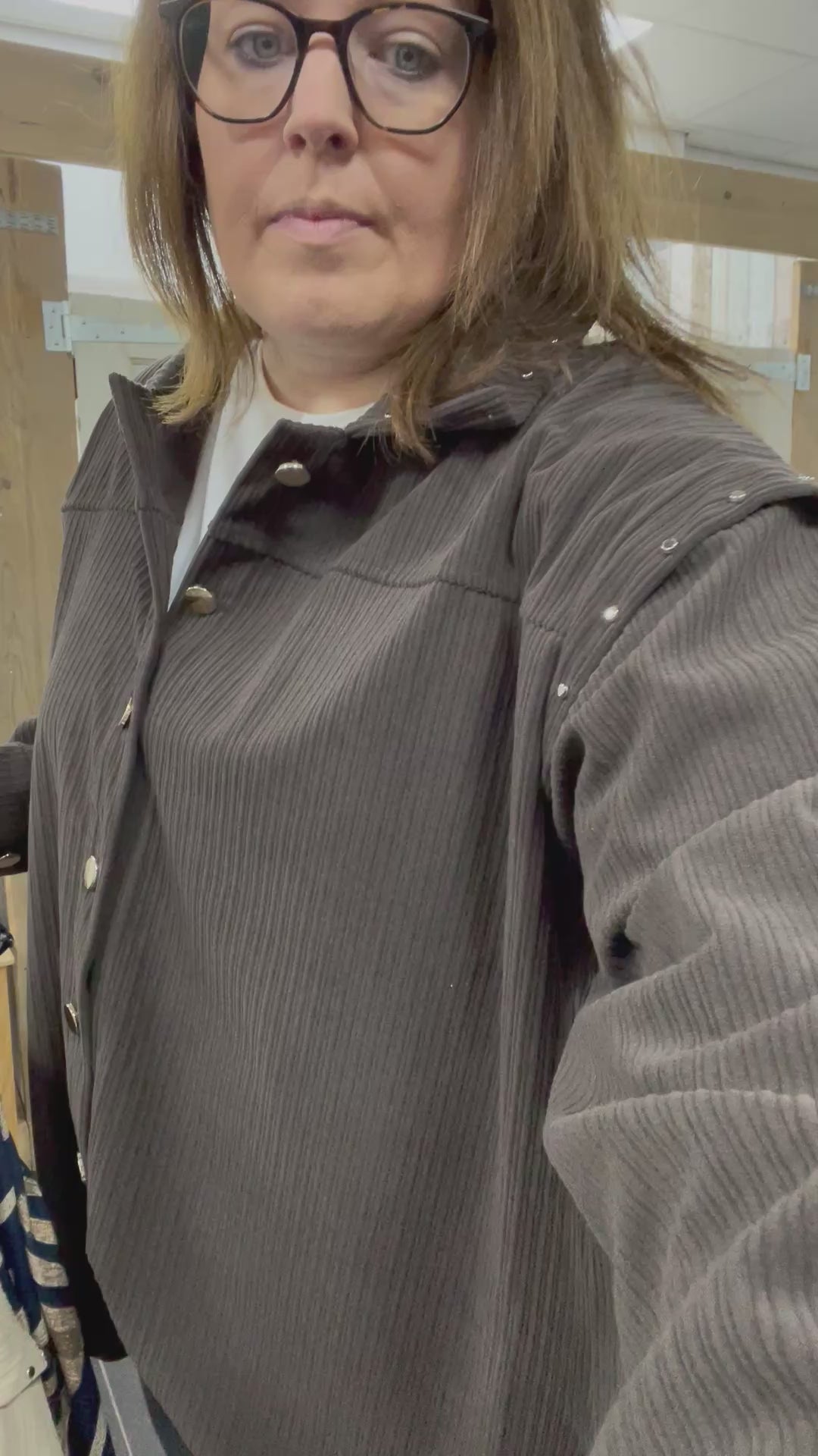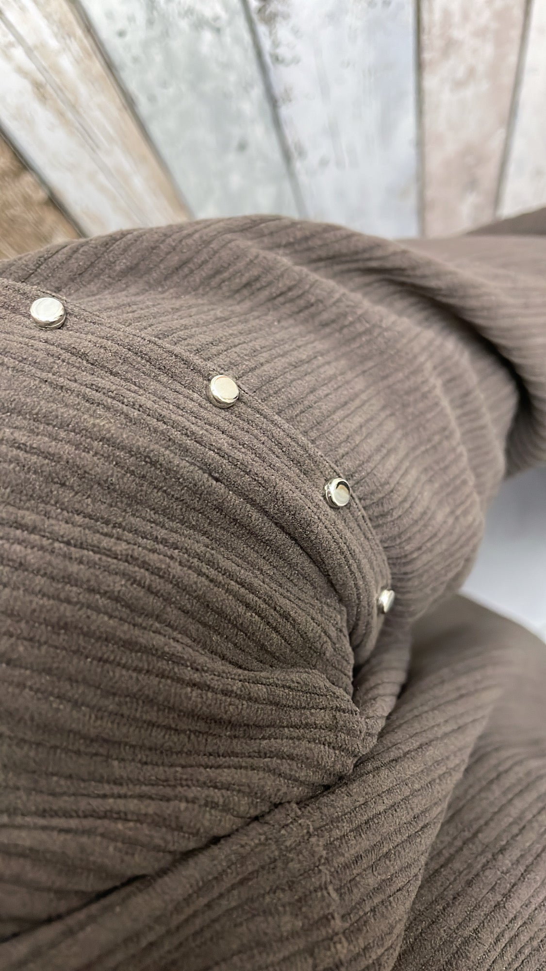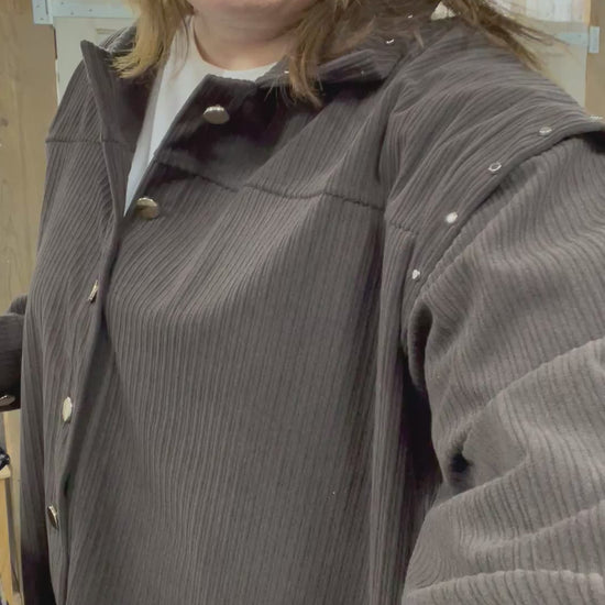 Op de kraag en op de mouw zit een randje met studs. Deze zijn zilverkleurig.