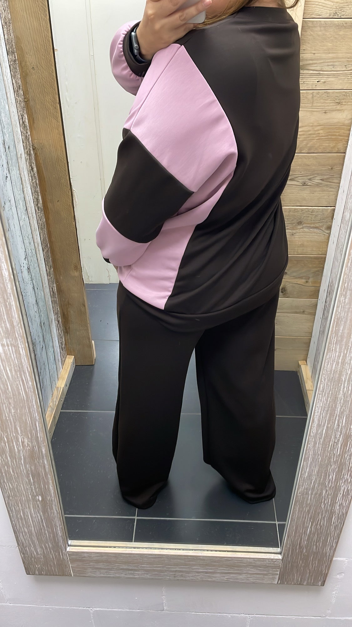 De trui heeft lange mouwen en de broek heeft een wijde uitlopende pijp.