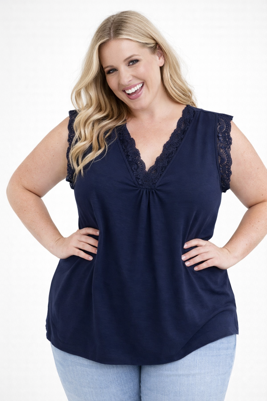 Een heerlijke effe top met een kanten V-hals. Ook bij de uiteinden van de 'mouw' zit kant.