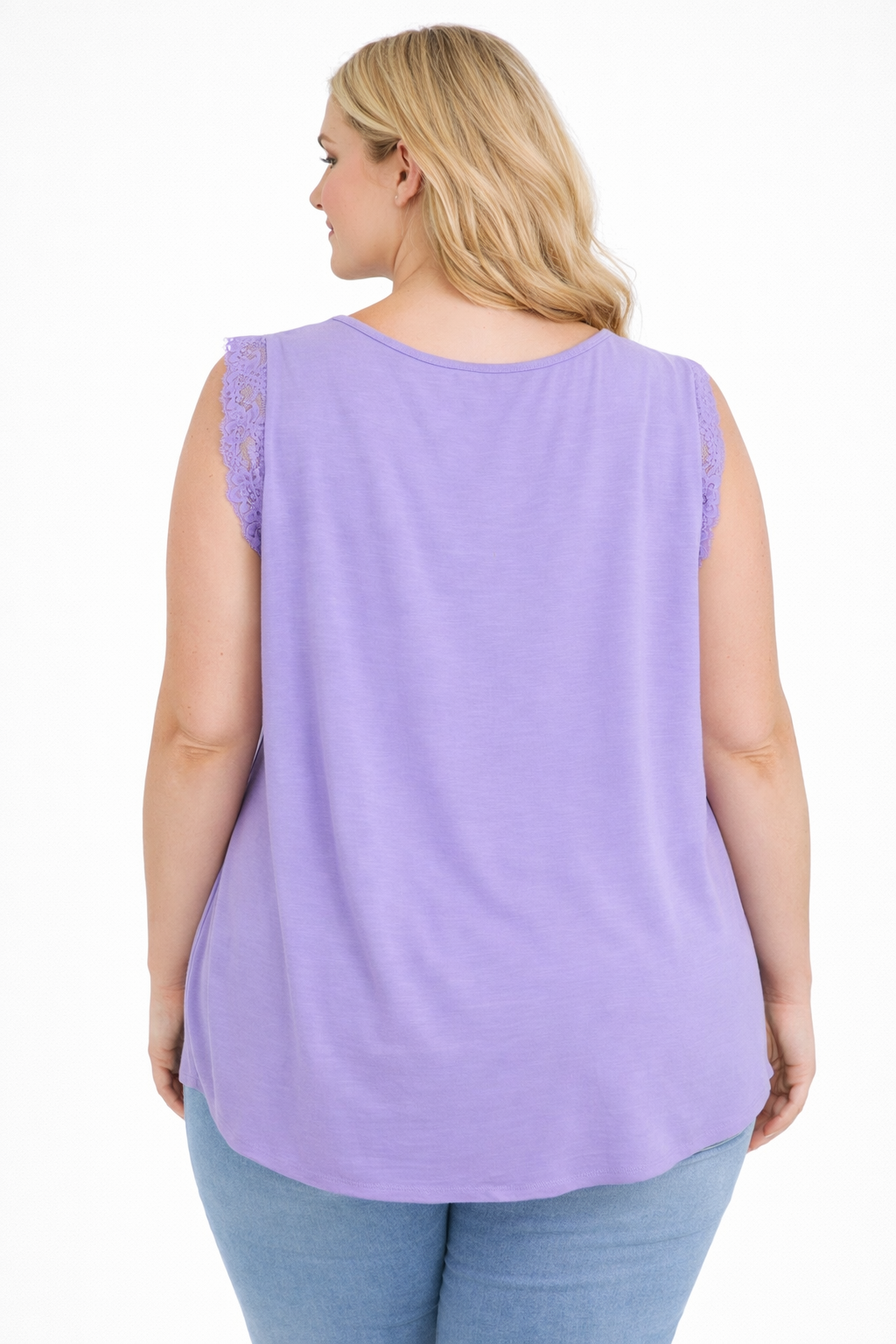 Een heerlijke effe top met een kanten V-hals. Ook bij de uiteinden van de 'mouw' zit kant.
