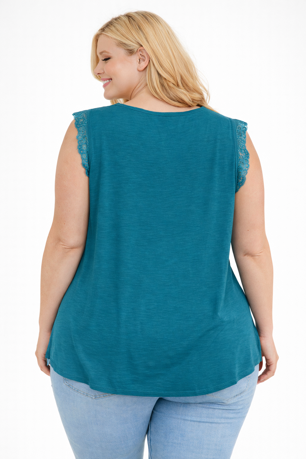 Een heerlijke effe top met een kanten V-hals. Ook bij de uiteinden van de 'mouw' zit kant.