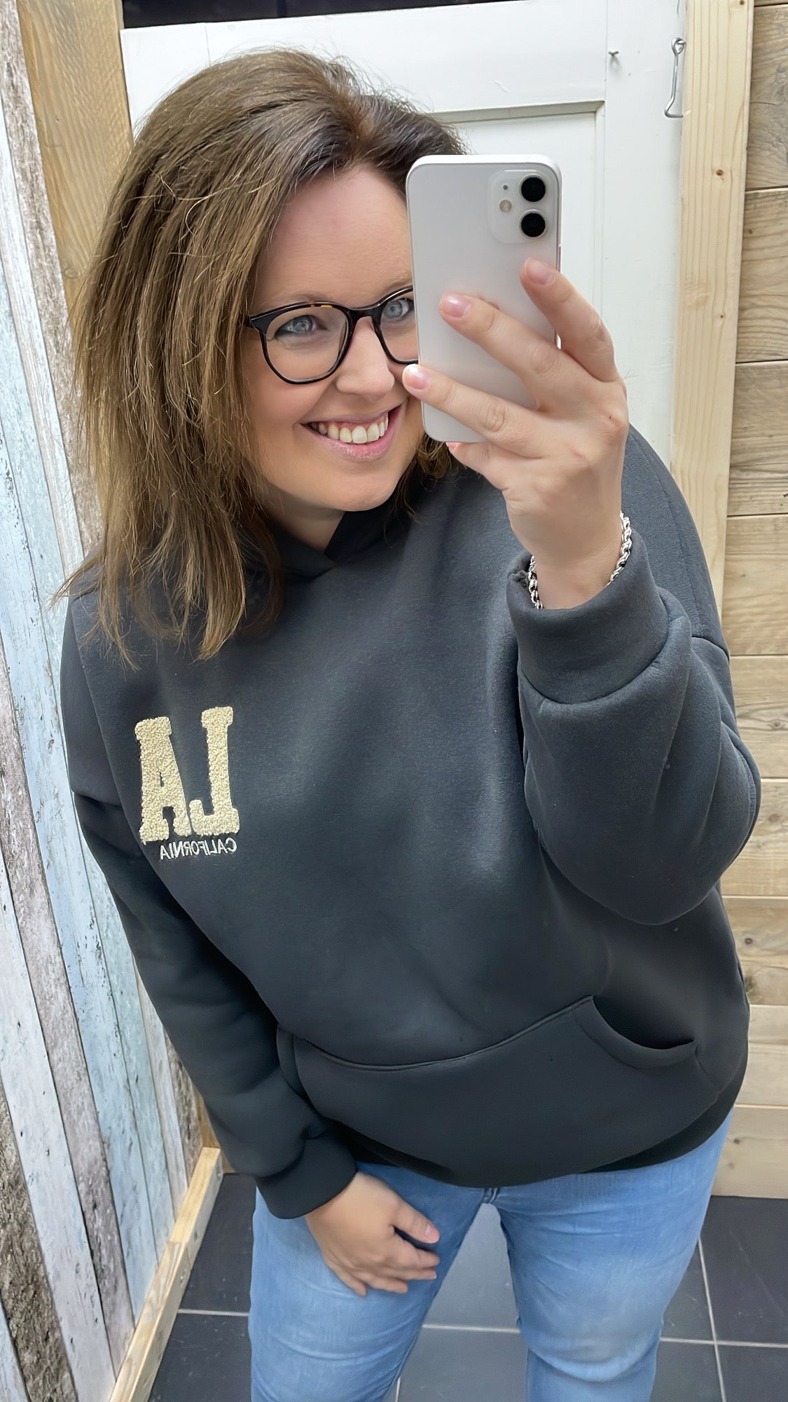 Op de voorkant staat de tekst 'LA' in een teddystof met daaronder een borduursel 'California'