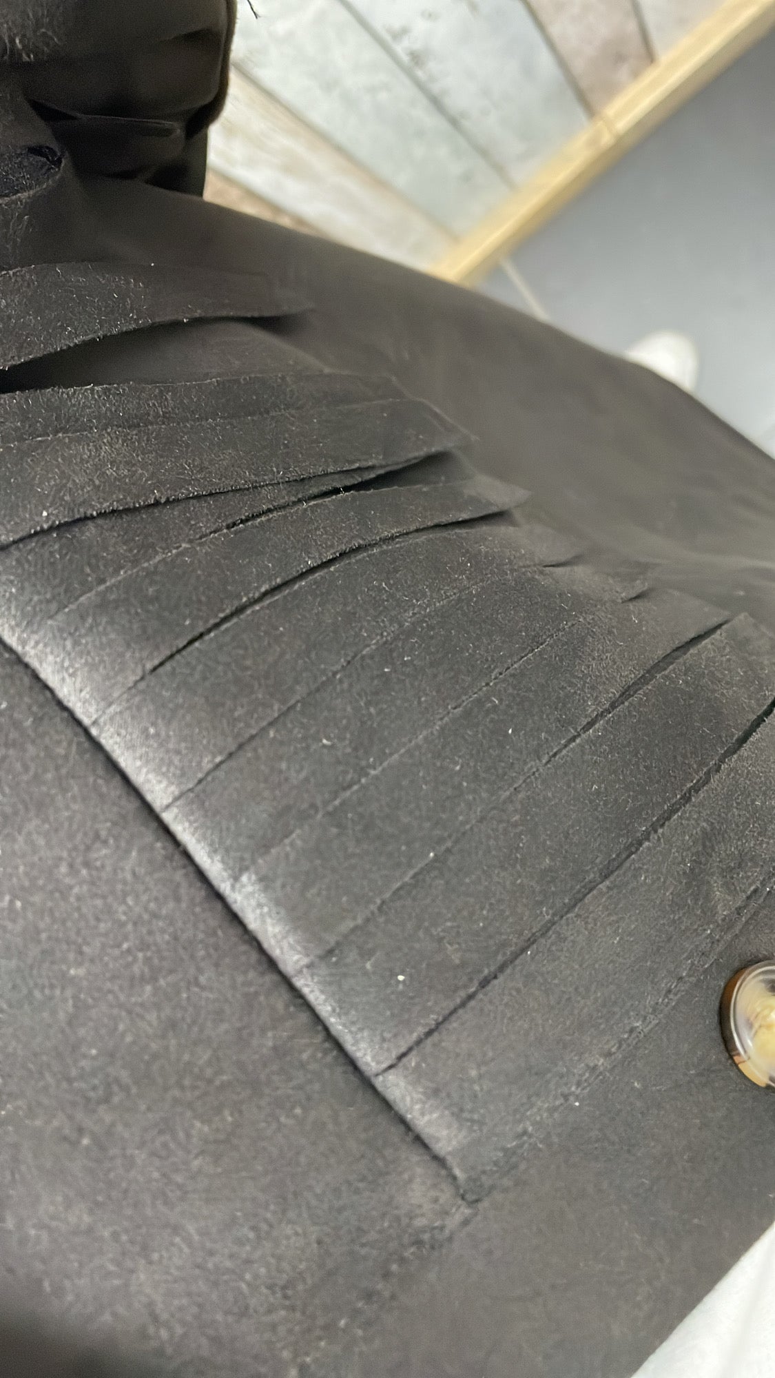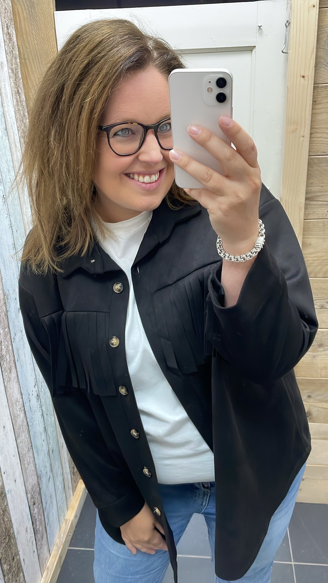 Het jasje heeft lange mouwen en aan de voorkant zitten franjes.