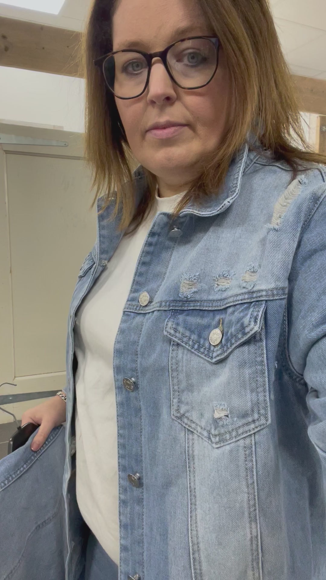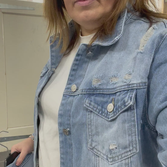 Het spijkerjasje kan zowel dicht als open gedragen worden.
