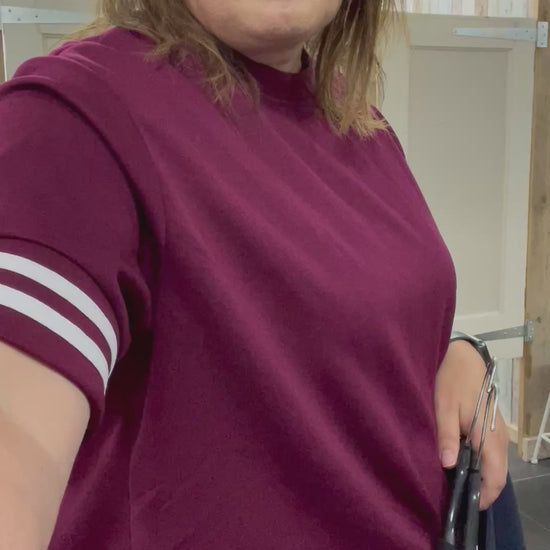 De top heeft korte mouwen en op de mouw zit een dubbele witte bies.