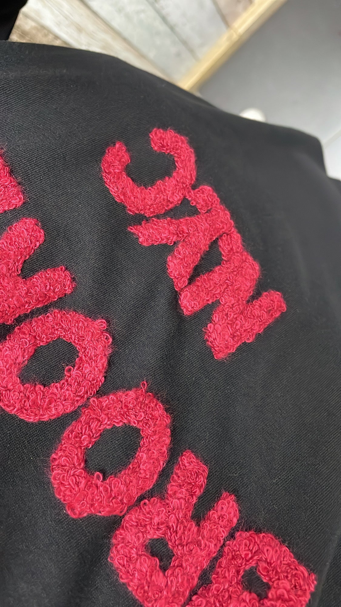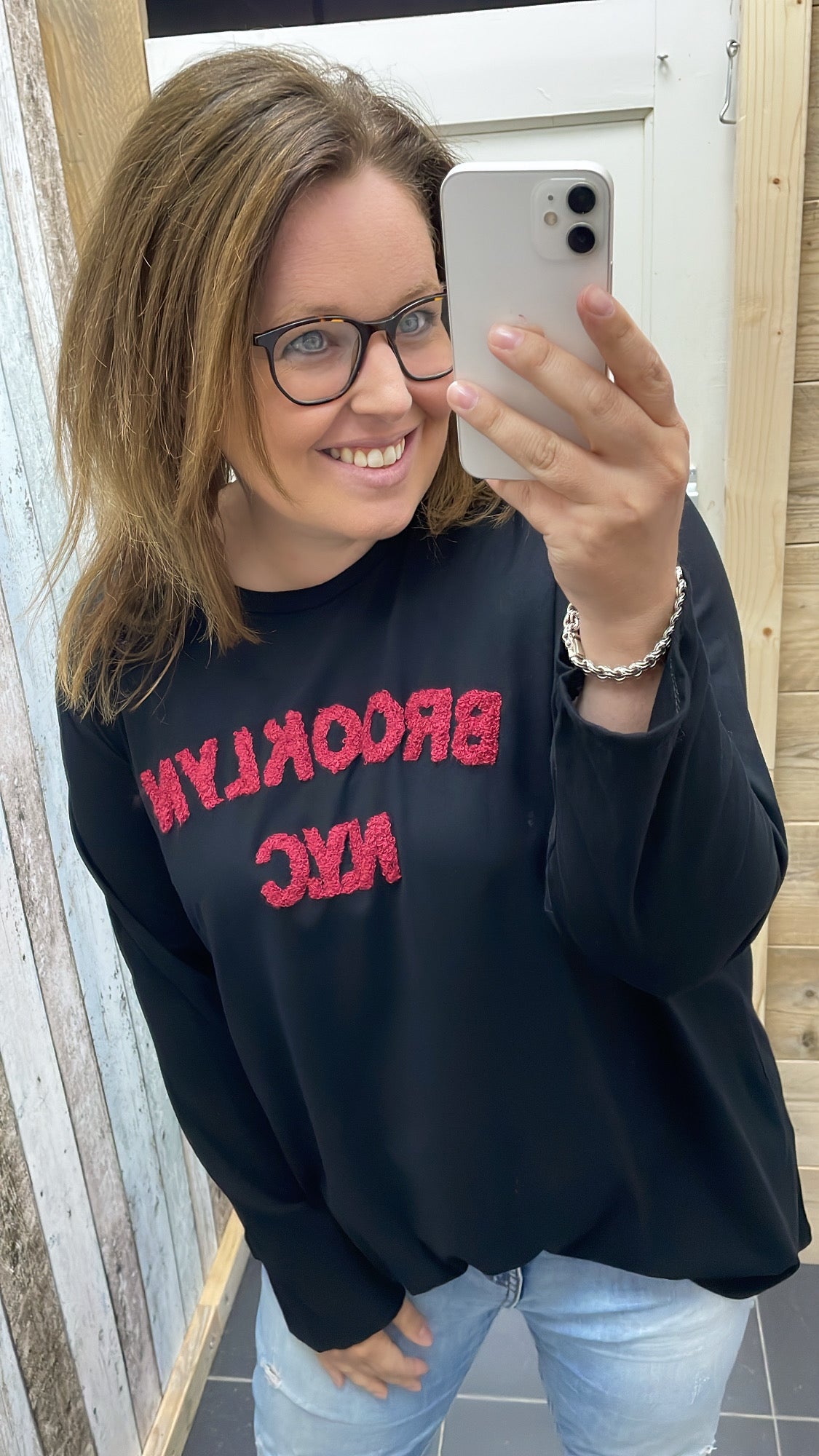 De top heeft een ronde hals en op de voorkant staat in een teddystof de tekst 'BROOKLYN'