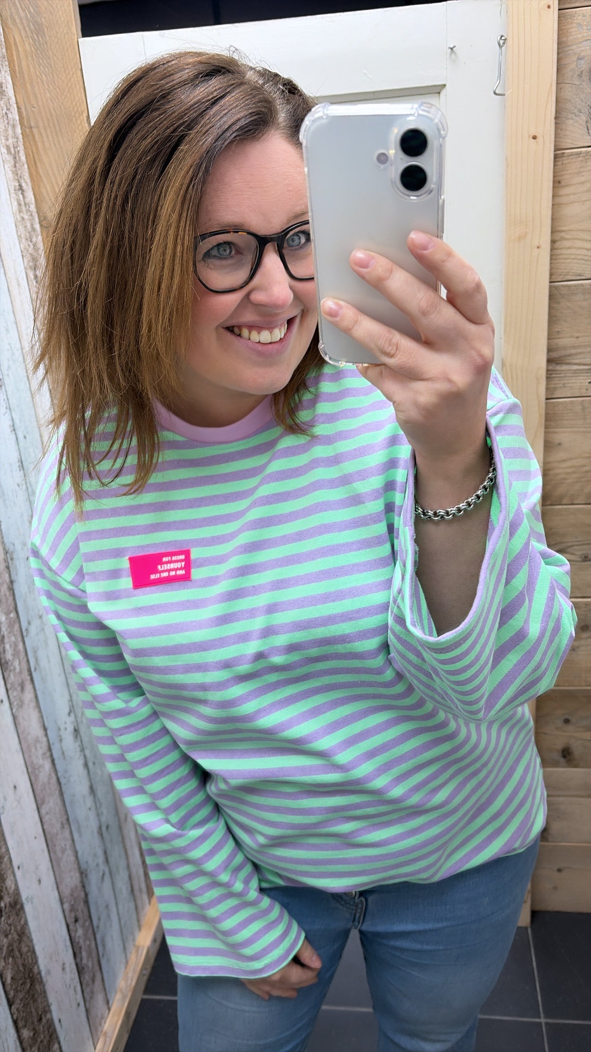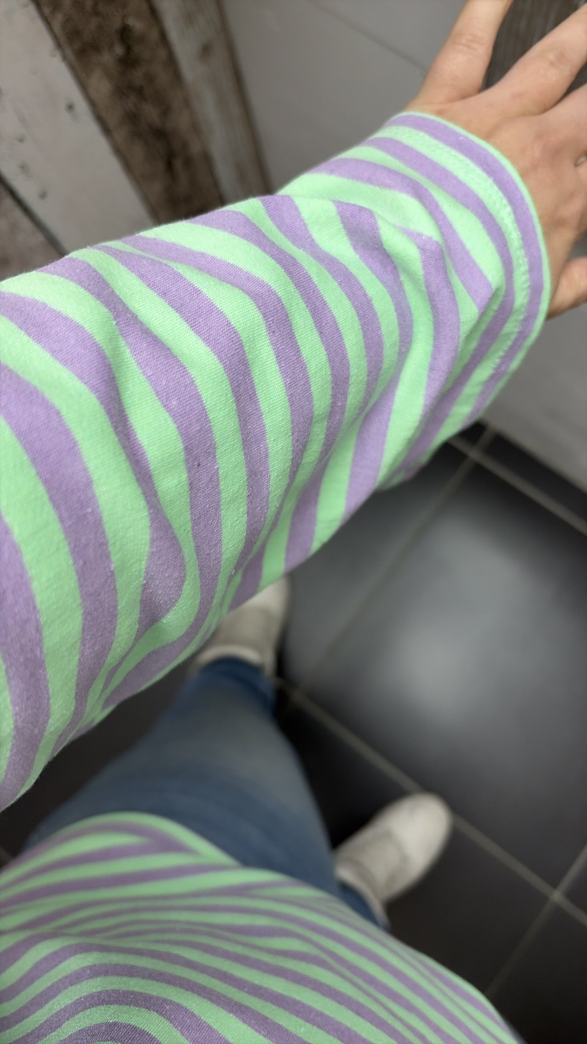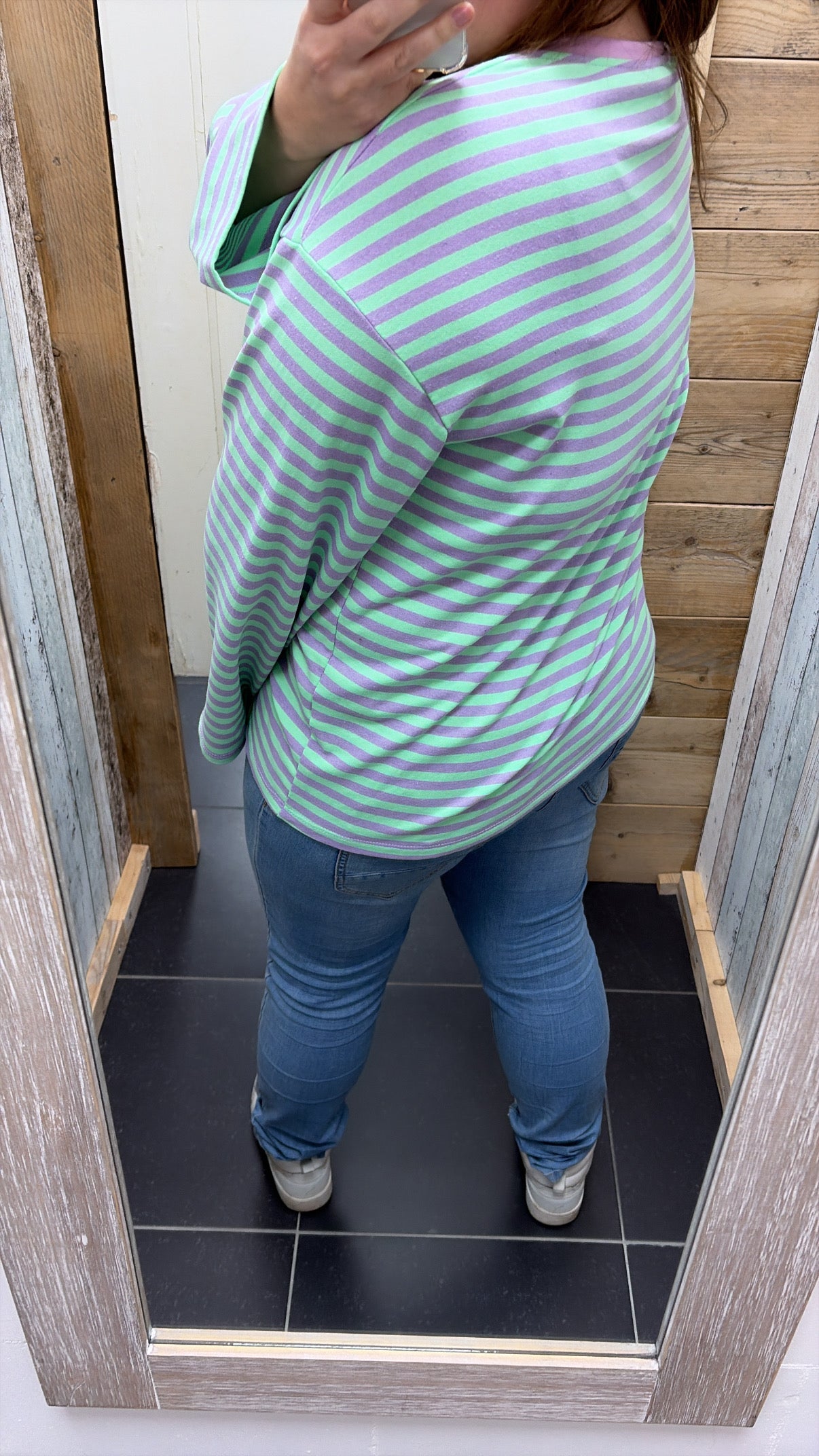 De top heeft strepen en de mouwen lopen van onder iets breder uit.