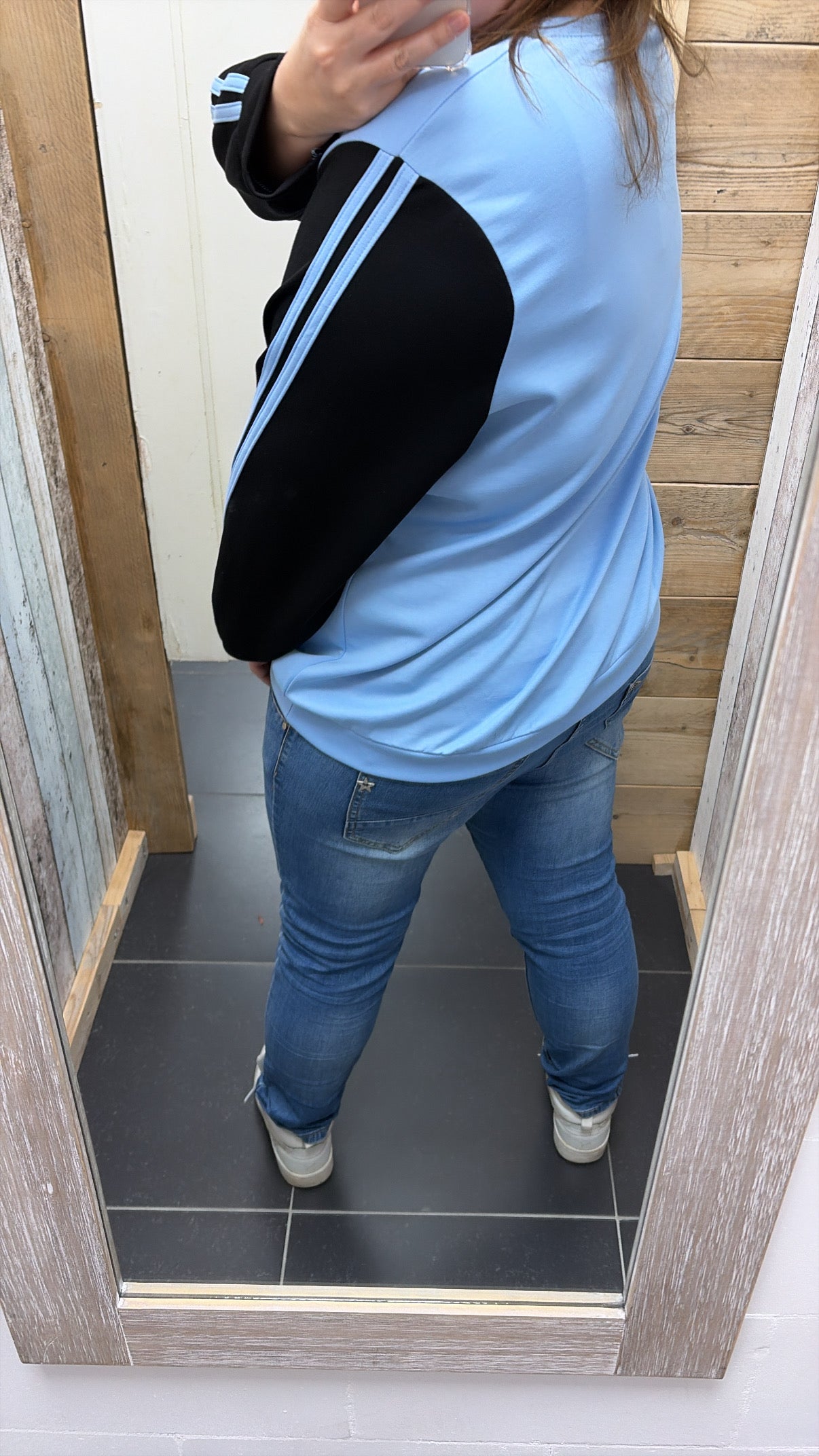 Op de mouwen van de trui zit een dubbele bies gestikt.