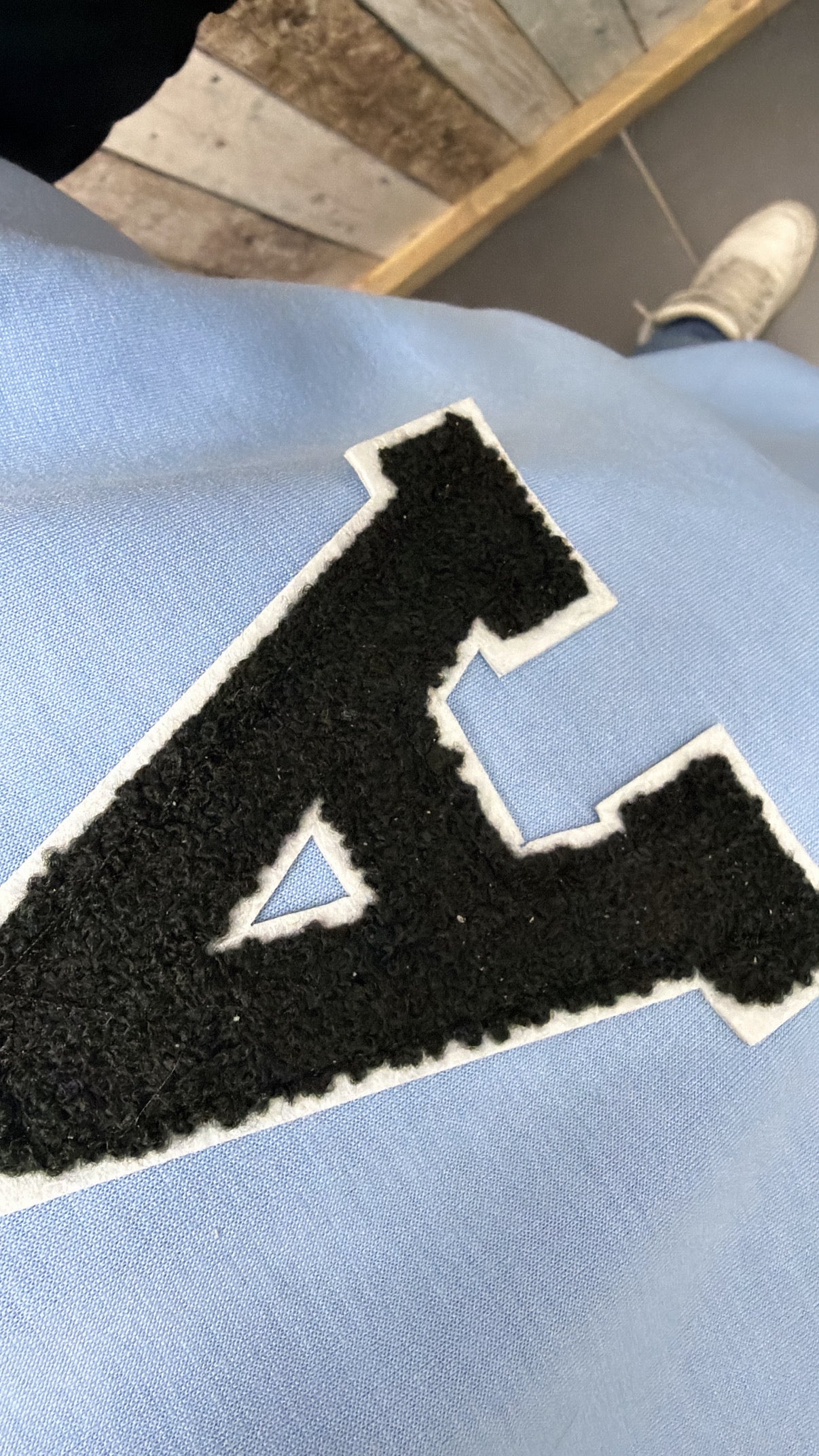 Op de voorkant staat een embleem met de letter 'A' welke is gemaakt van teddystof.