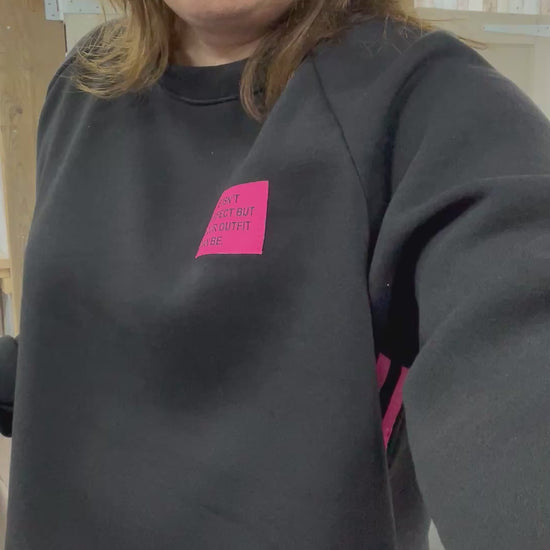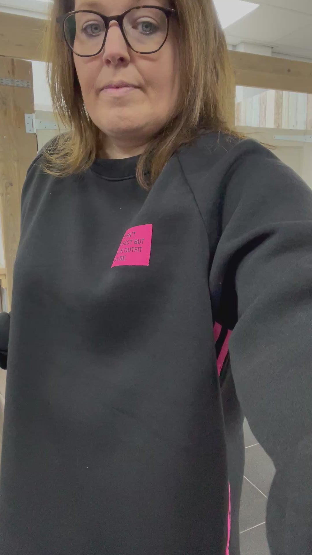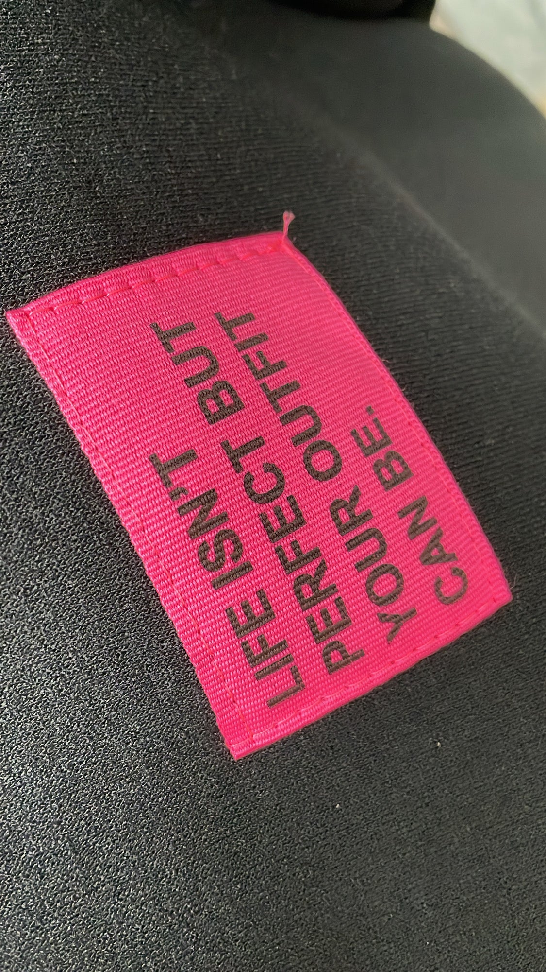Op de voorkant zit een embleem met de tekst 'Life isn't perfect but your outfit can be'