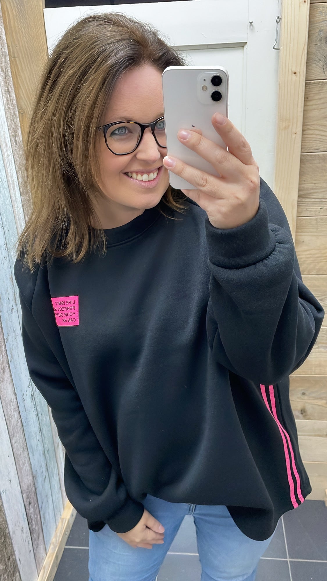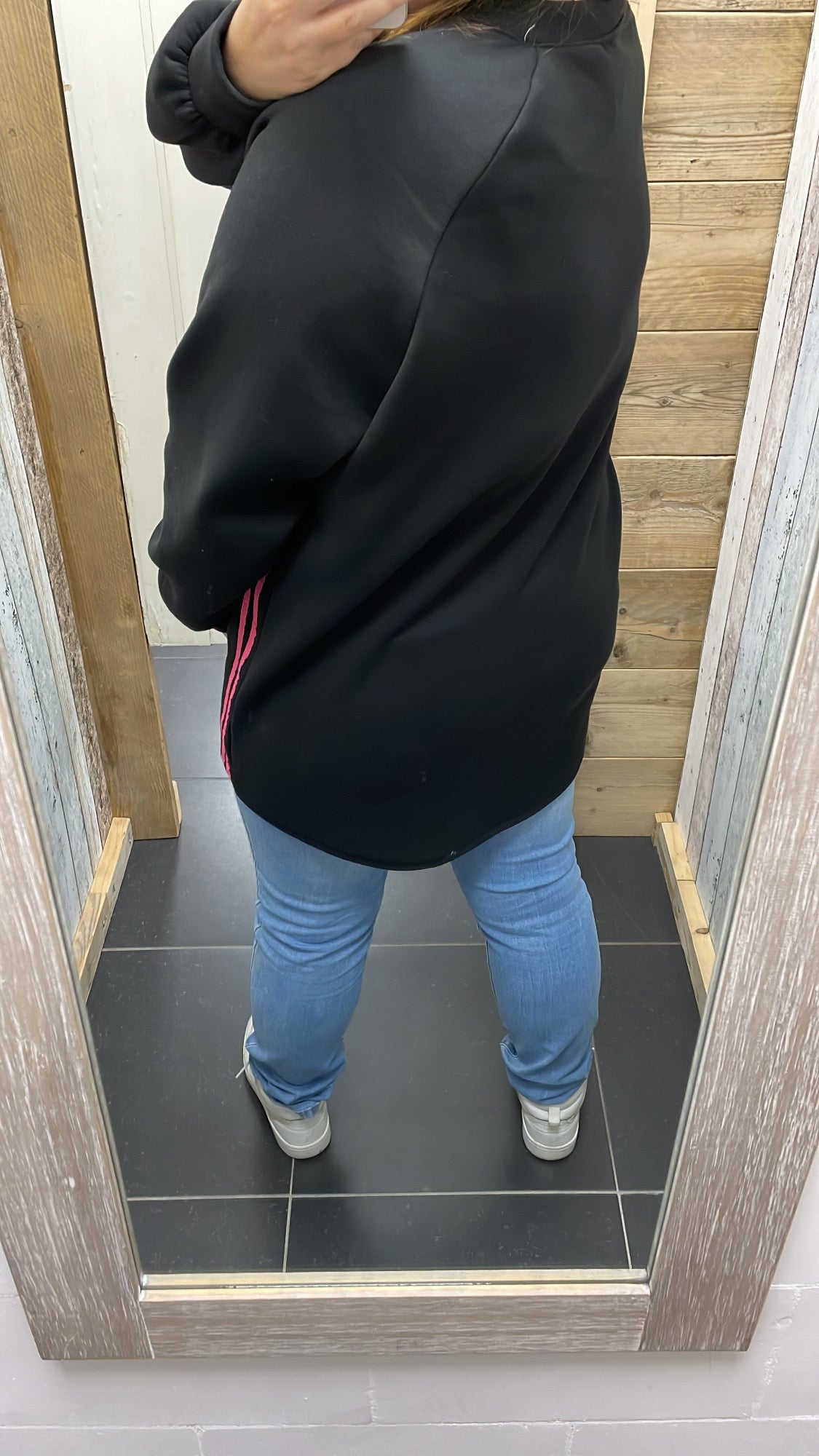 Aan de zijkant van de trui zit een roze (dubbele) bies.