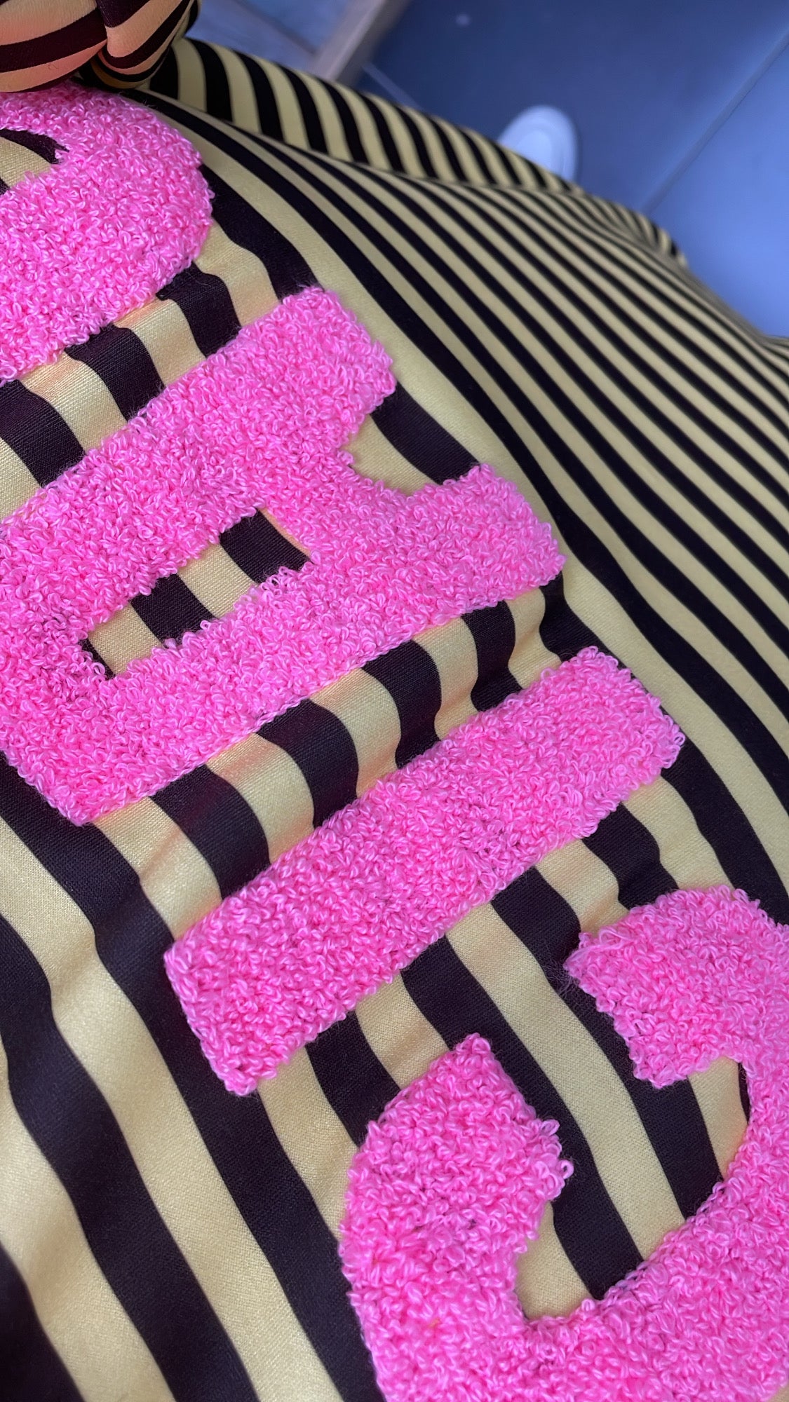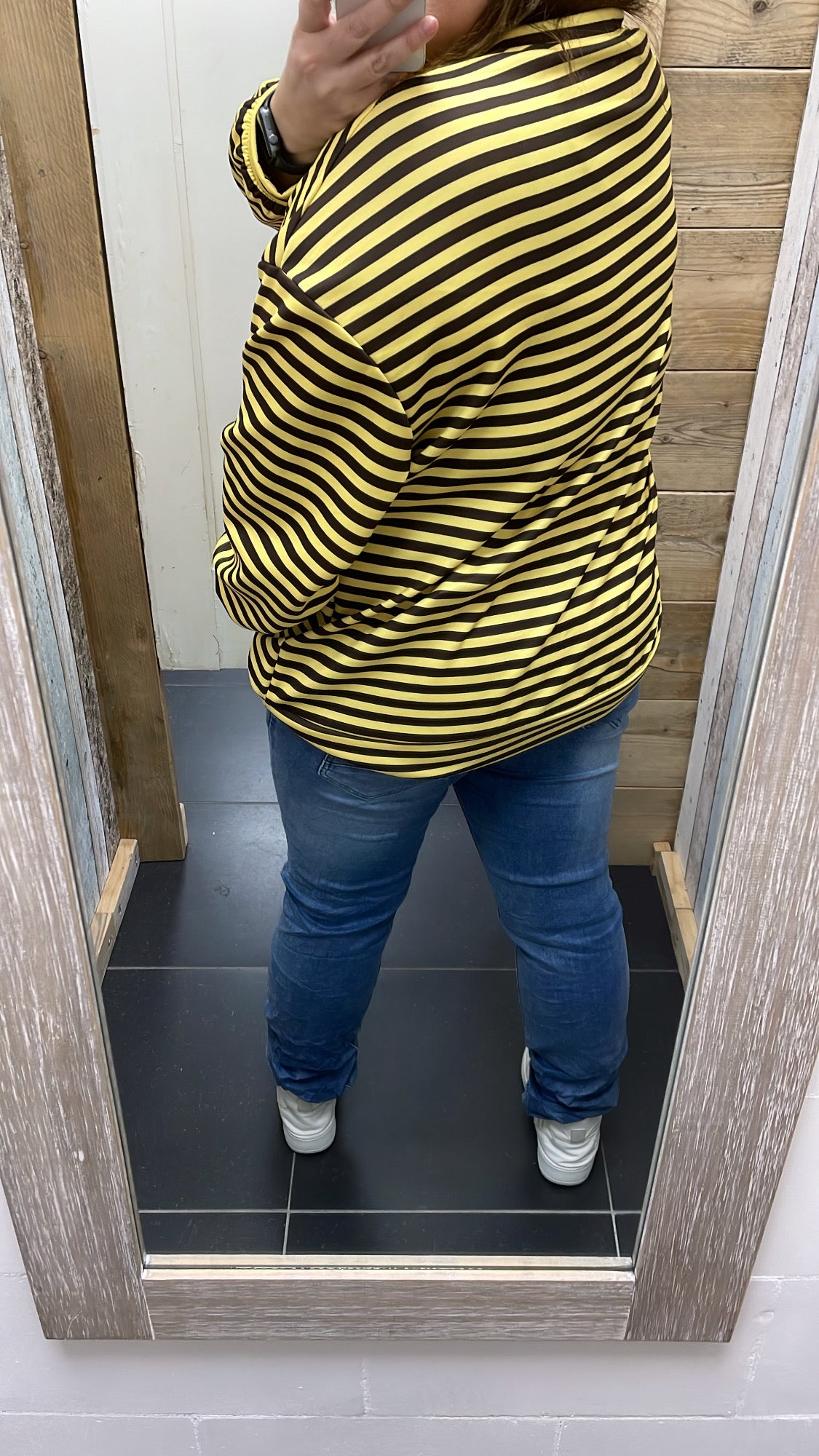 Hoe gaaf is deze streeptrui met teddystof tekst op de voorkant.