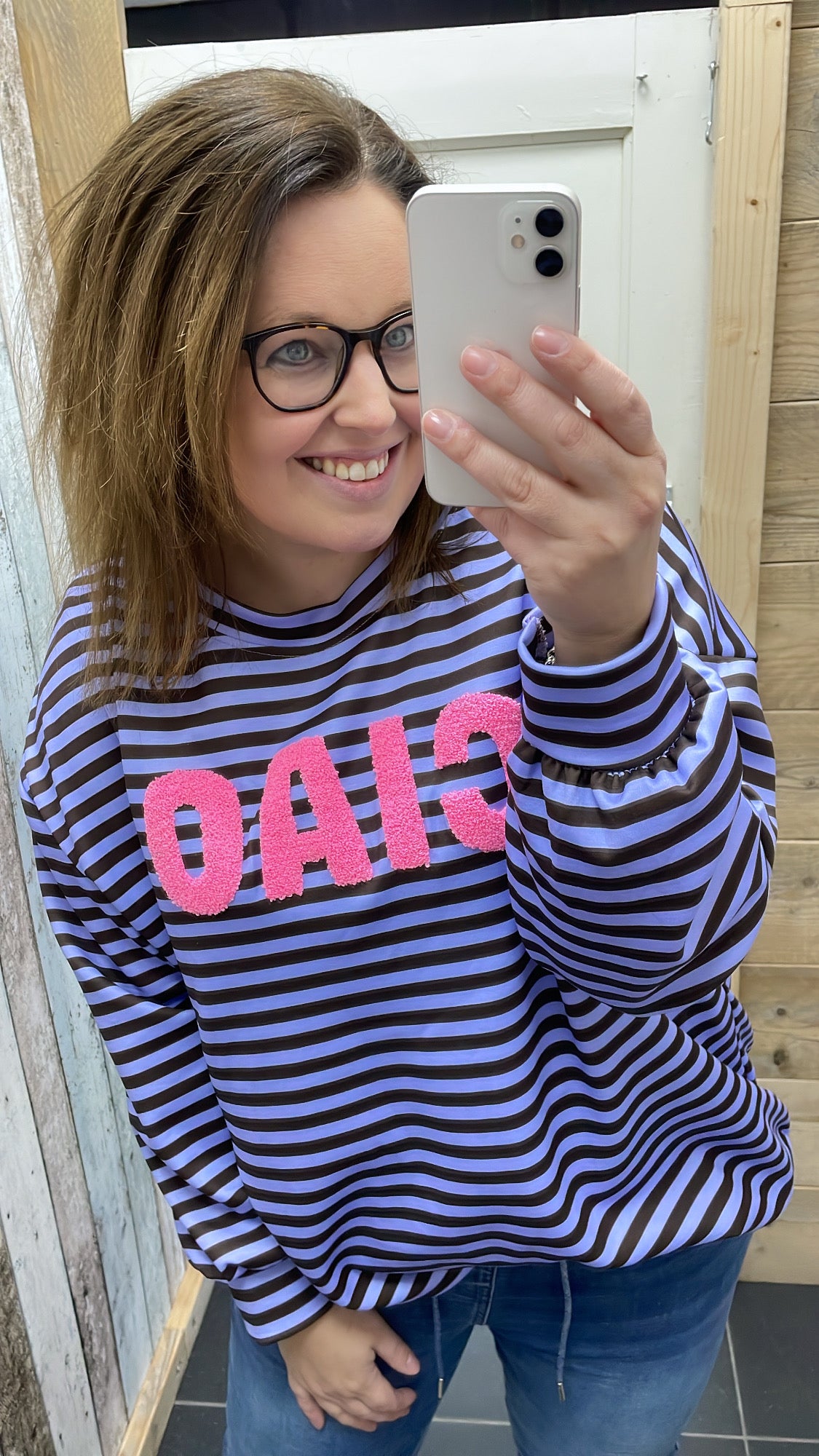 Hoe gaaf is deze streeptrui met teddystof tekst op de voorkant.