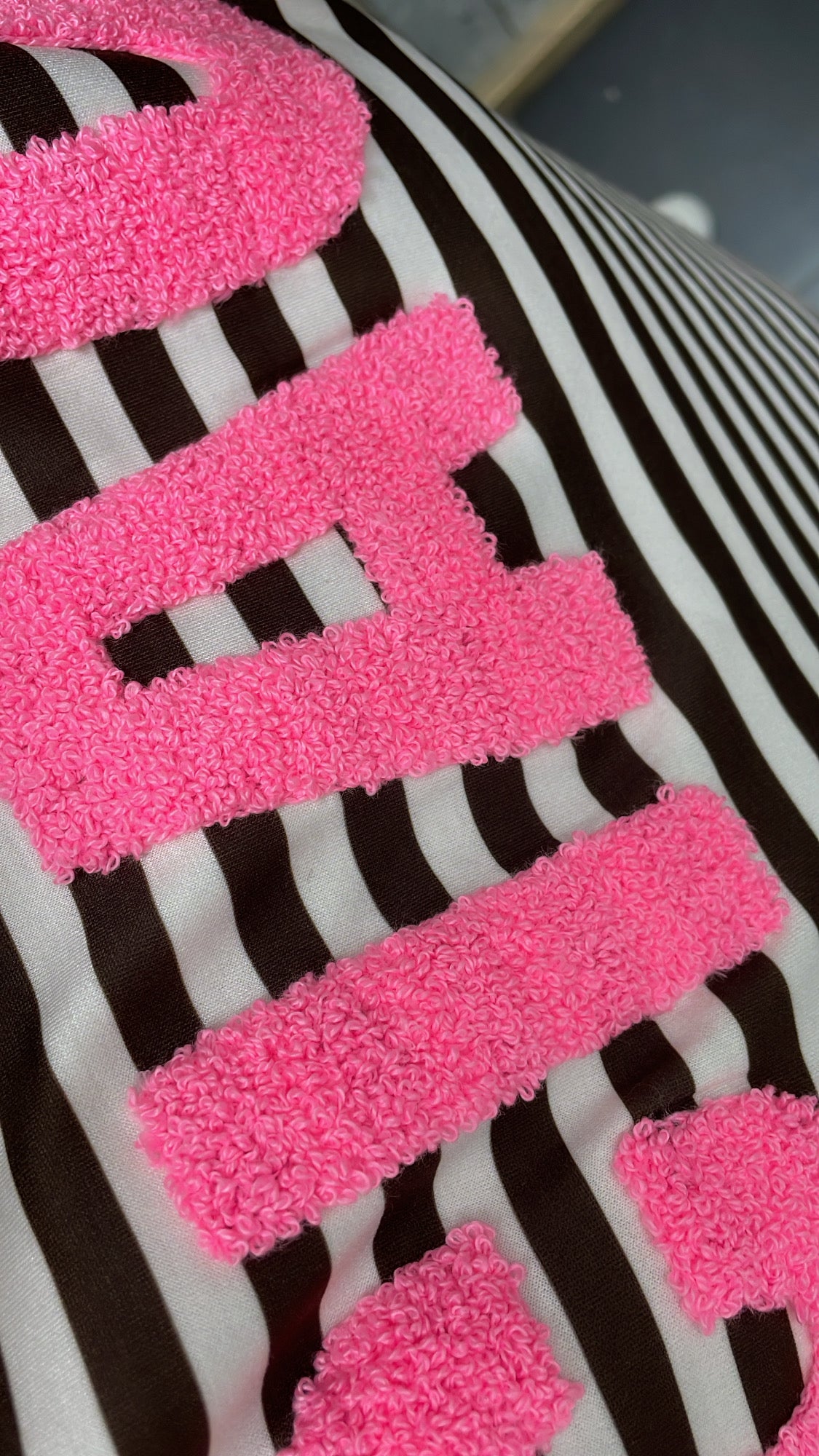 Hoe gaaf is deze streeptrui met teddystof tekst op de voorkant.