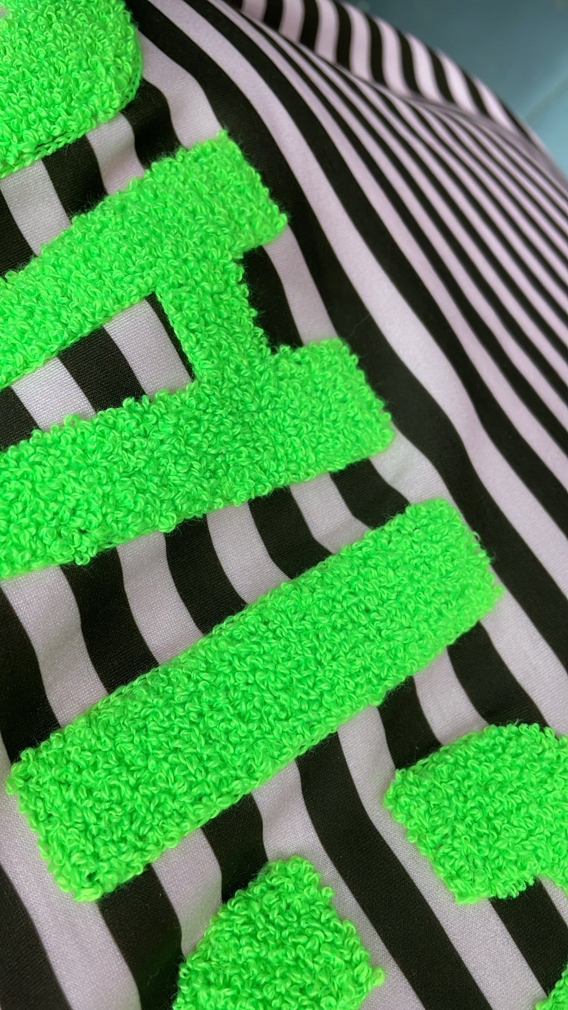 Hoe gaaf is deze streeptrui met teddystof tekst op de voorkant.