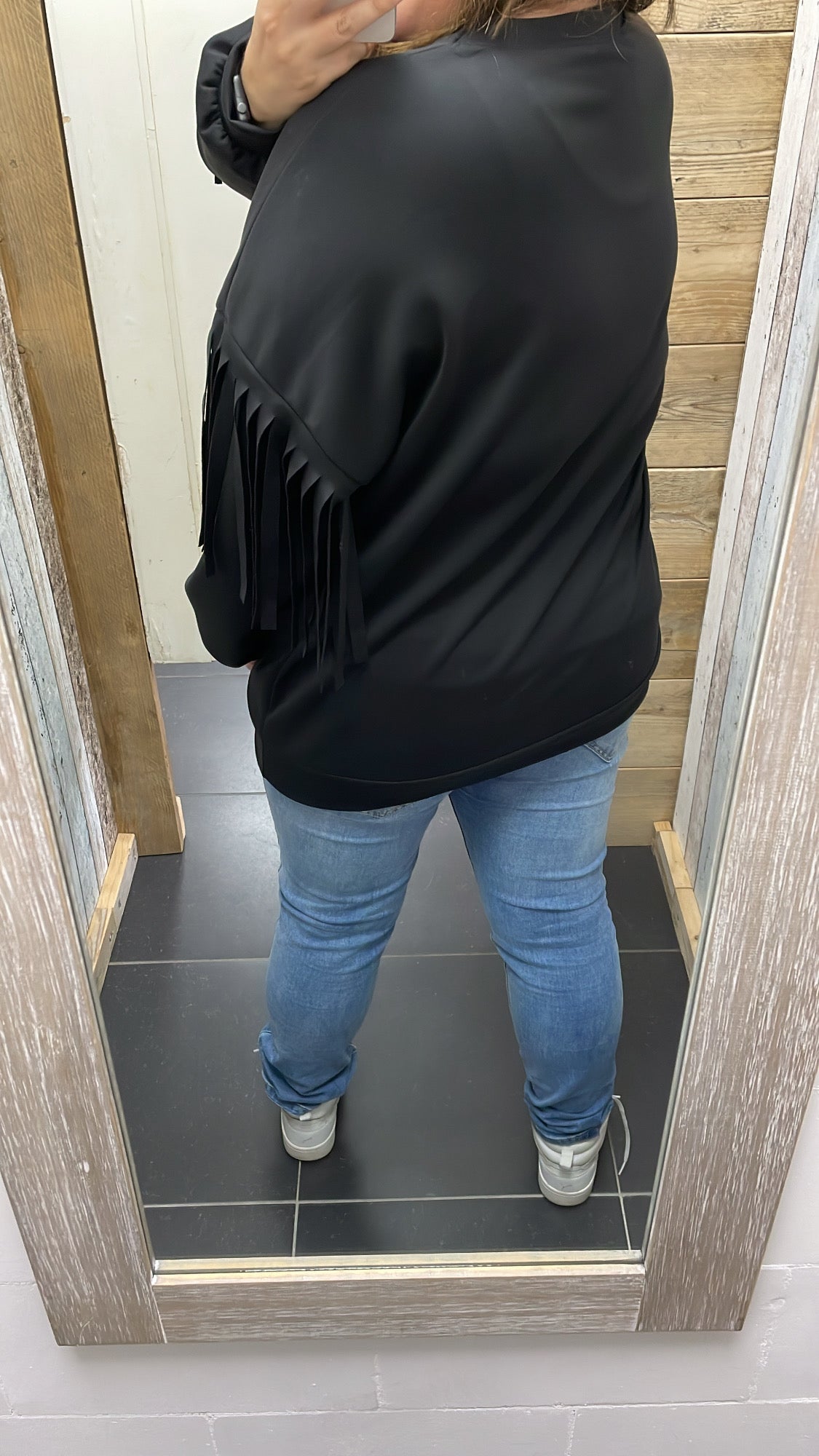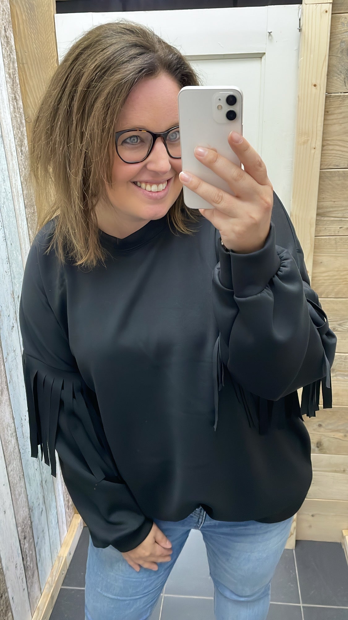 Deze leuke trui is basic maar heeft in het midden van de mouw een franje zitten.
