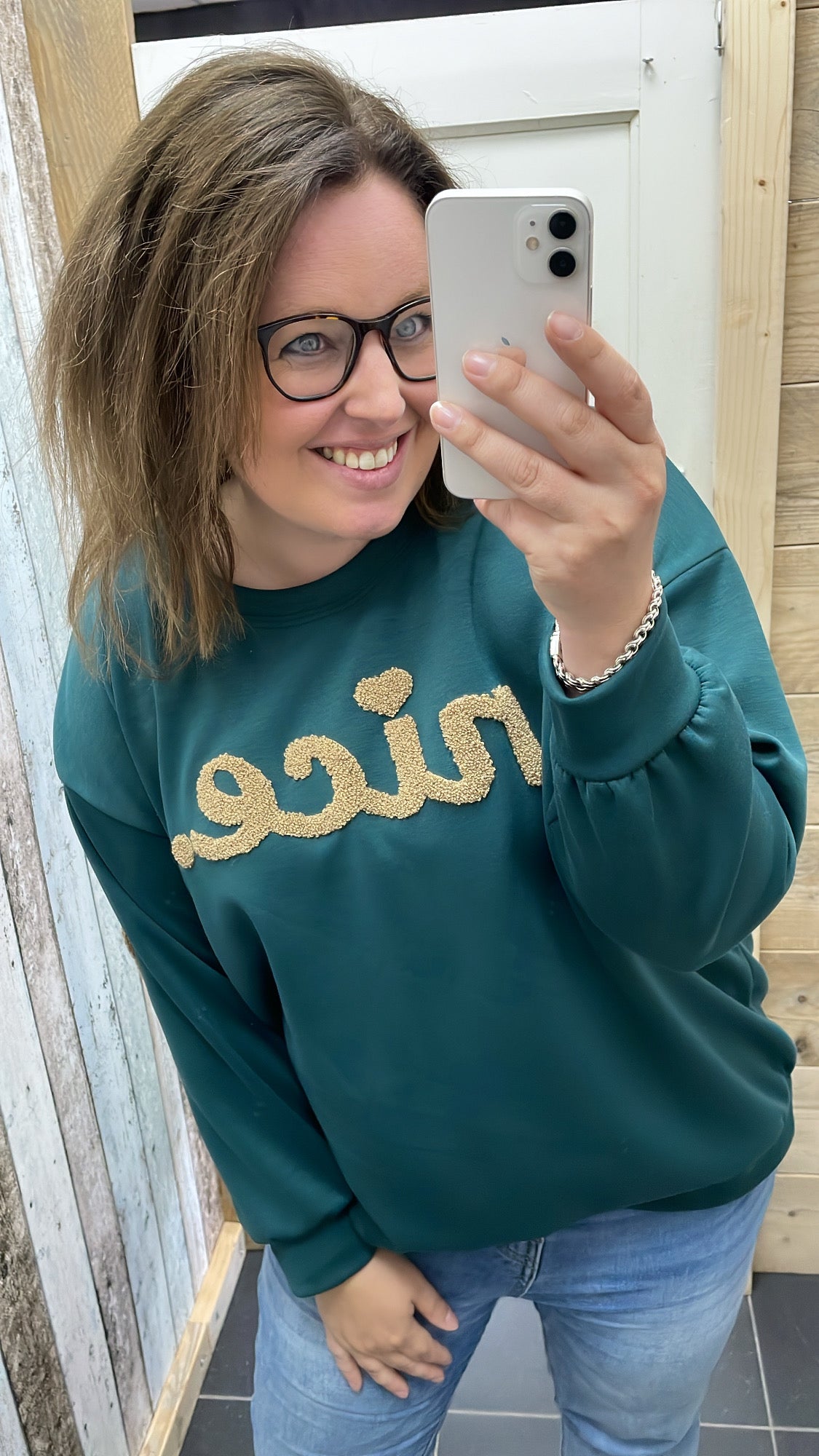 Hoe leuk is deze vrolijke trui met in een teddystof de tekst 'NICE'