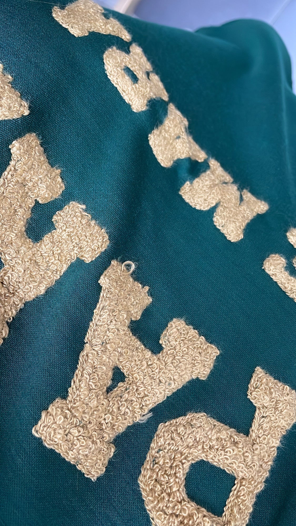 De tekst heeft een taupe kleur en staat in een teddy stof.
