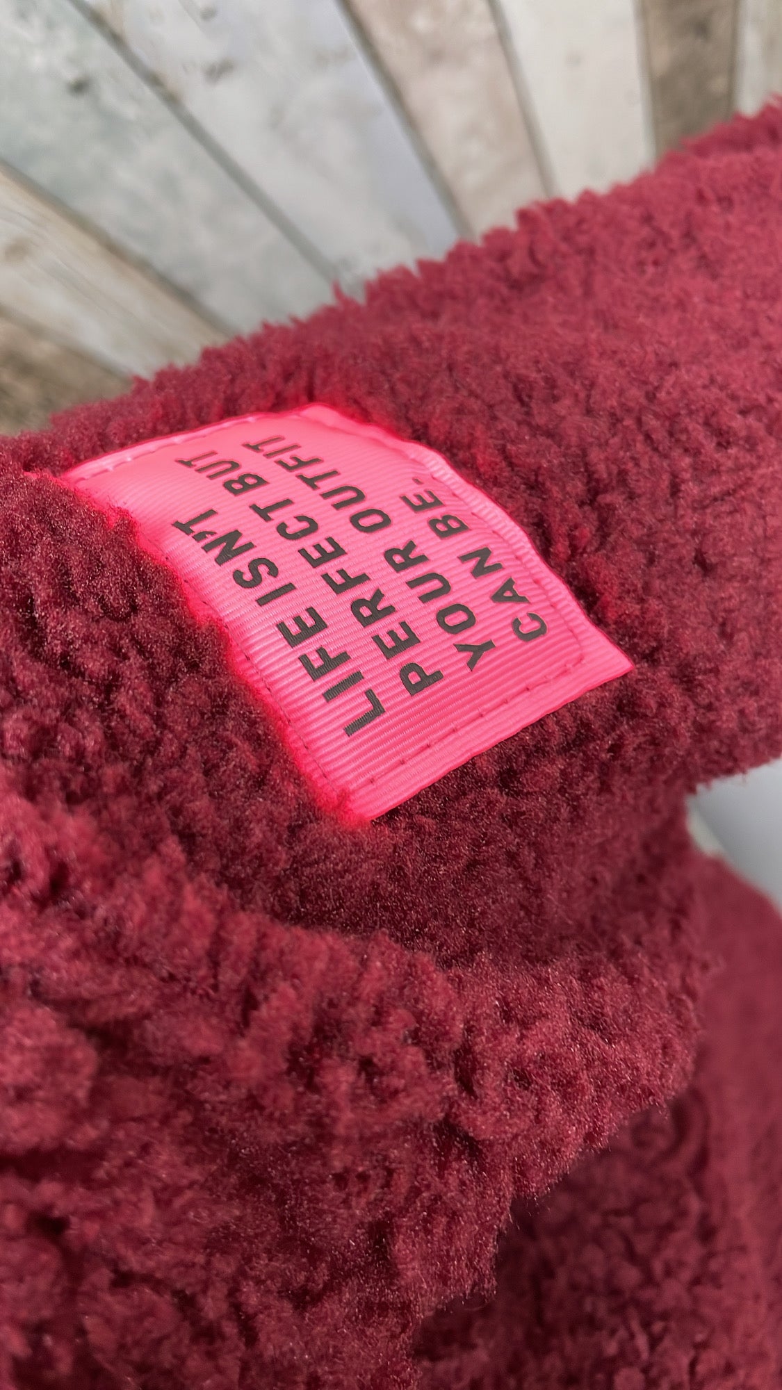 Op de mouw zit een embleem met de tekst 'Life isn't perfect but your outfit can be'