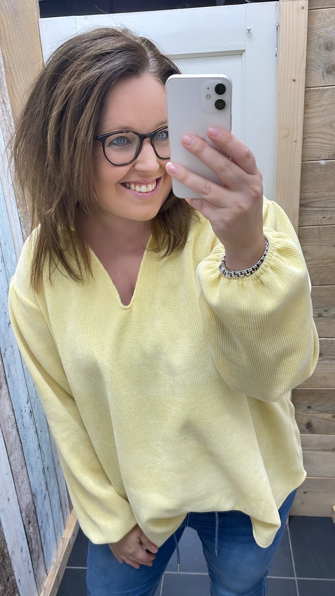 De trui valt wat langer waardoor je lekker je buik en billen kan verbergen.