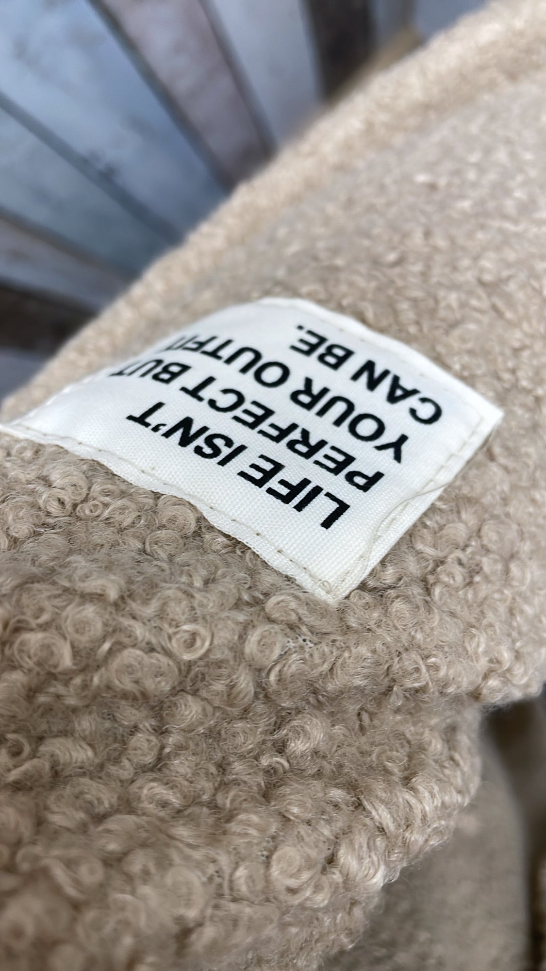 Op de mouw zit een embleem met de tekst 'life isn't perfect but your outfit can be'