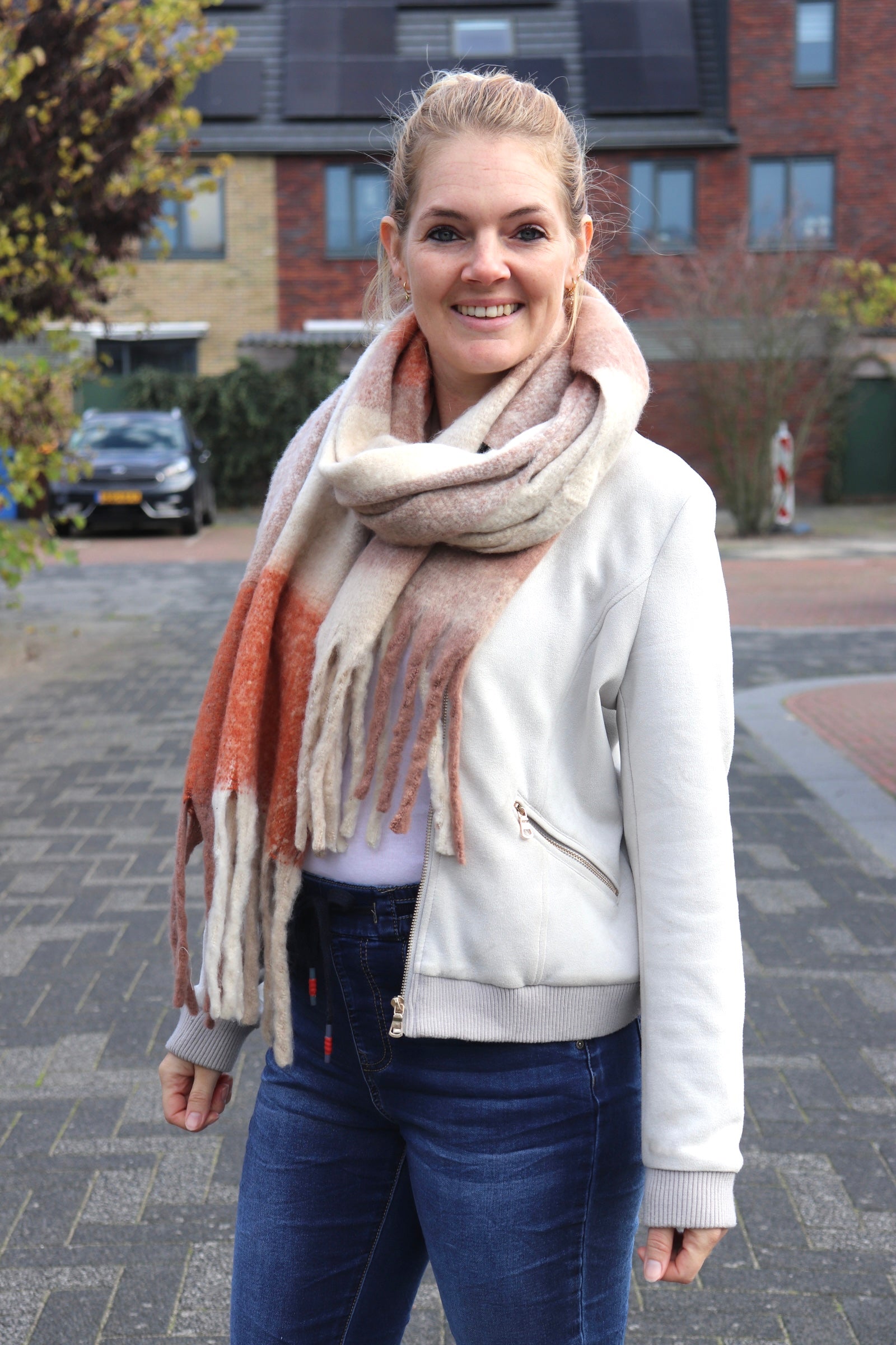 Een heerlijke warme sjaal met franjes aan de onderkant.
