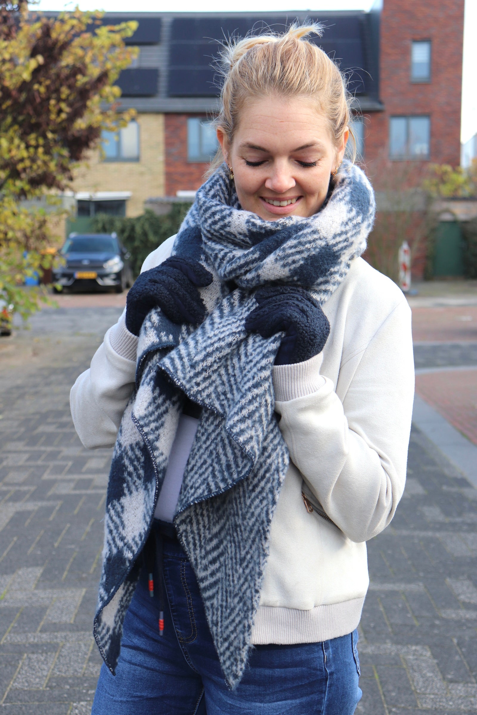Hoe leuk is deze heerlijke warme sjaal met een blokpatroon erop.