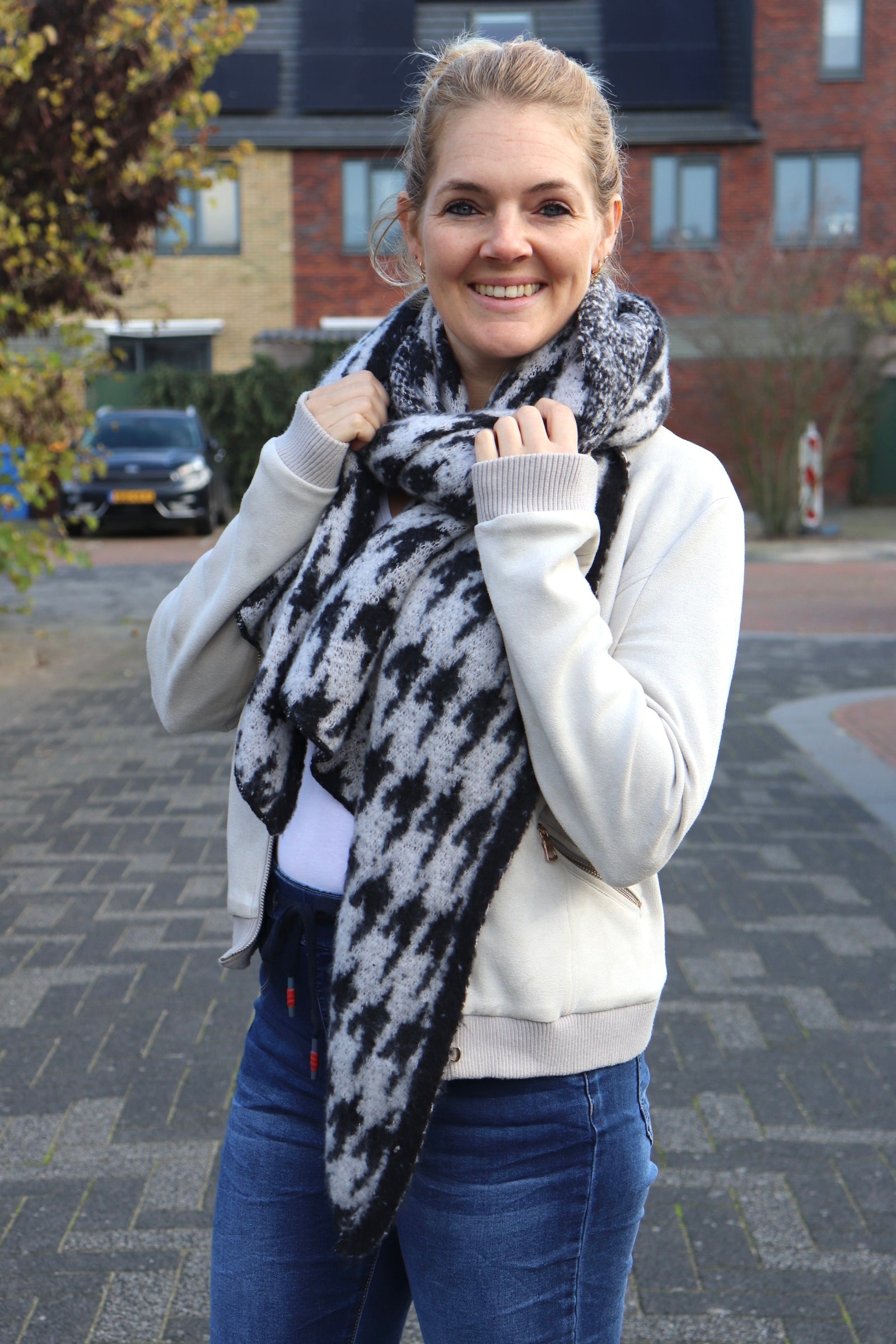 Hoe leuk is deze heerlijke warme sjaal met een blokpatroon erop.