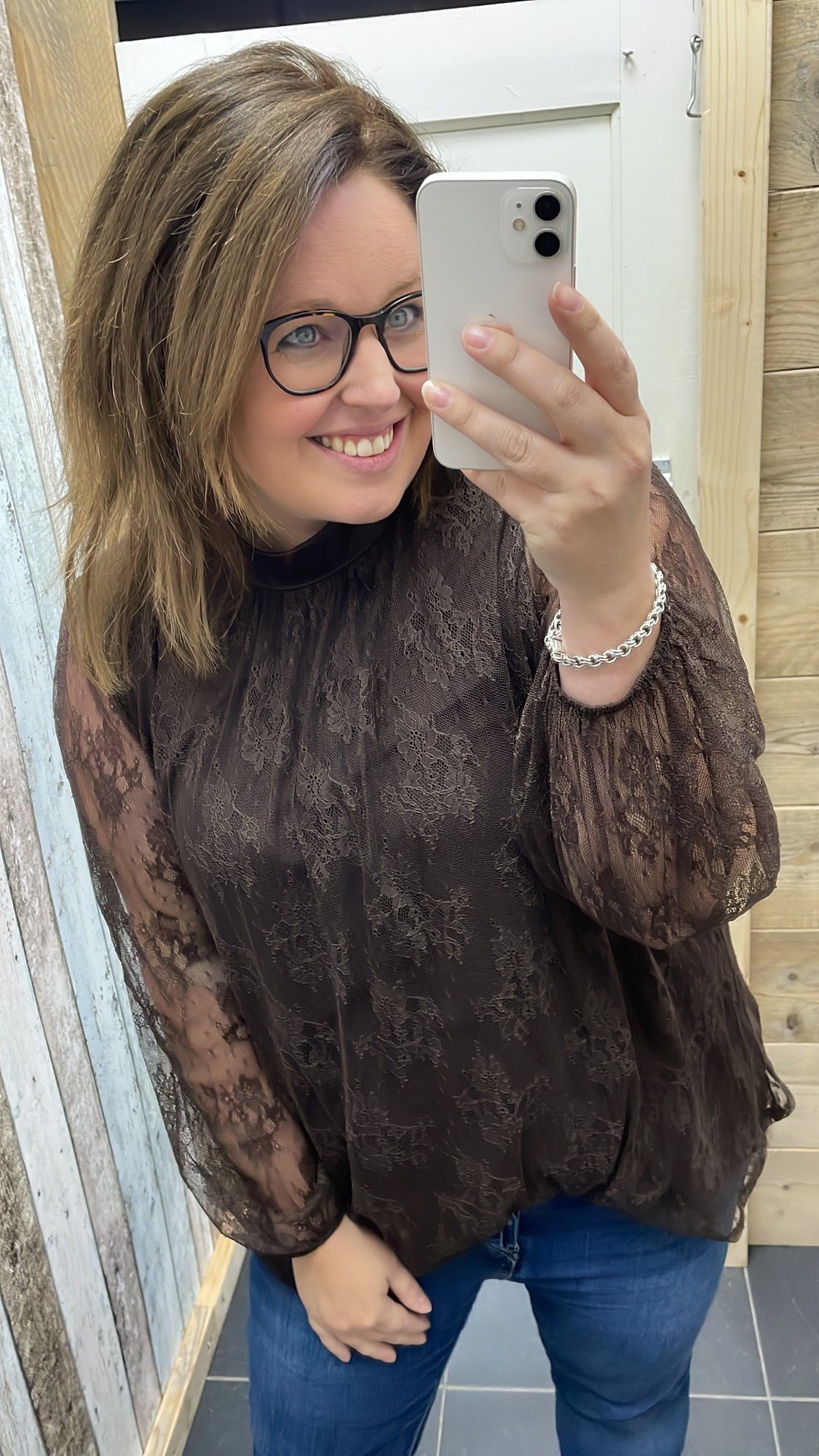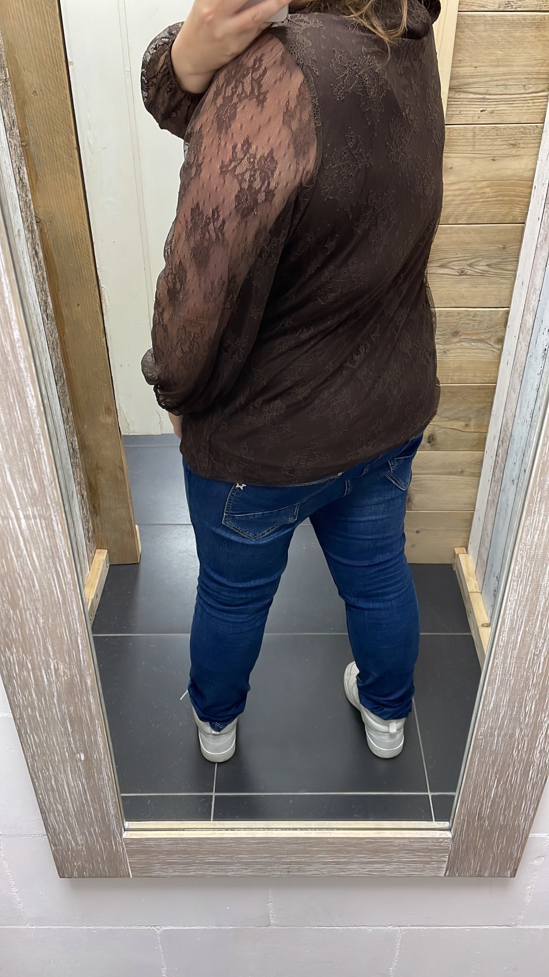 De mouwen zijn doorzichtig en hebben een bewerking van kant.