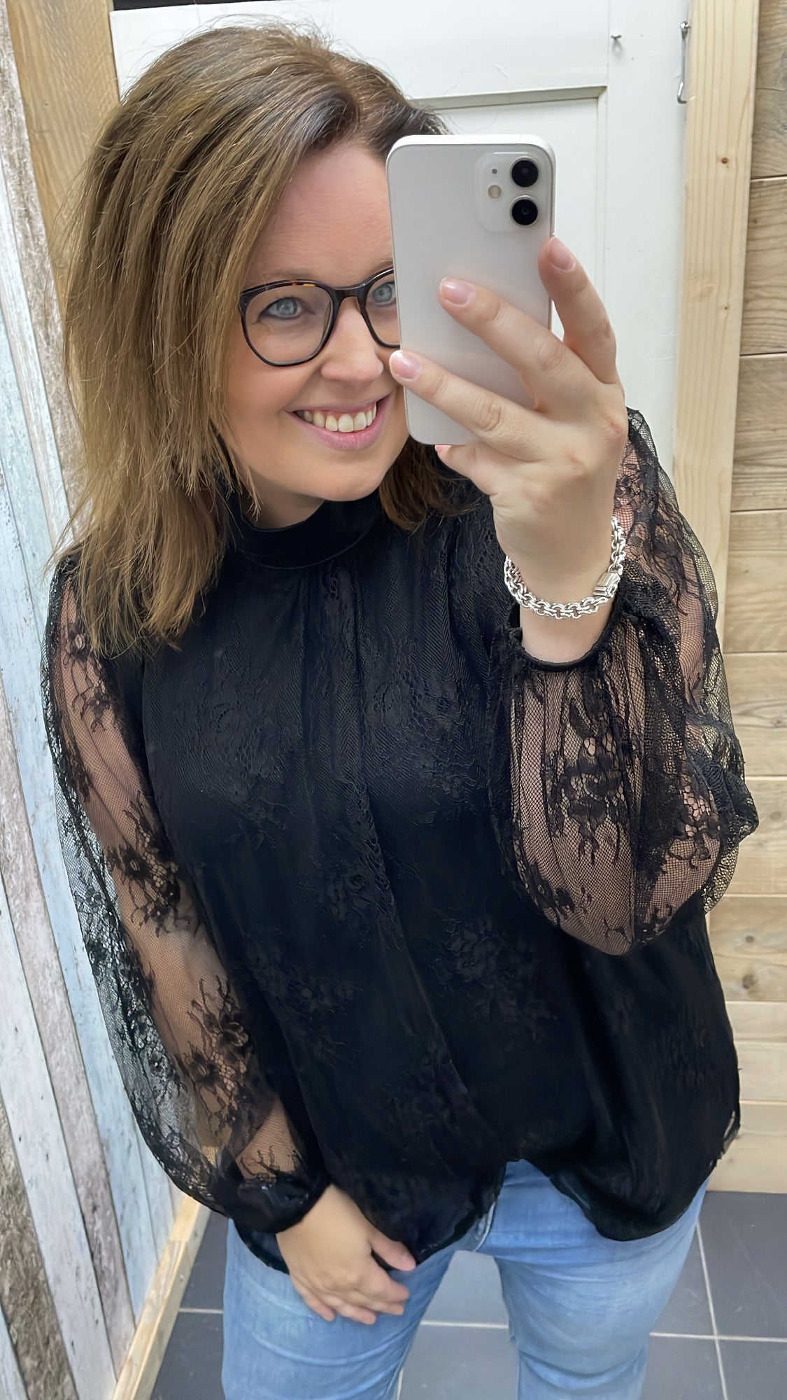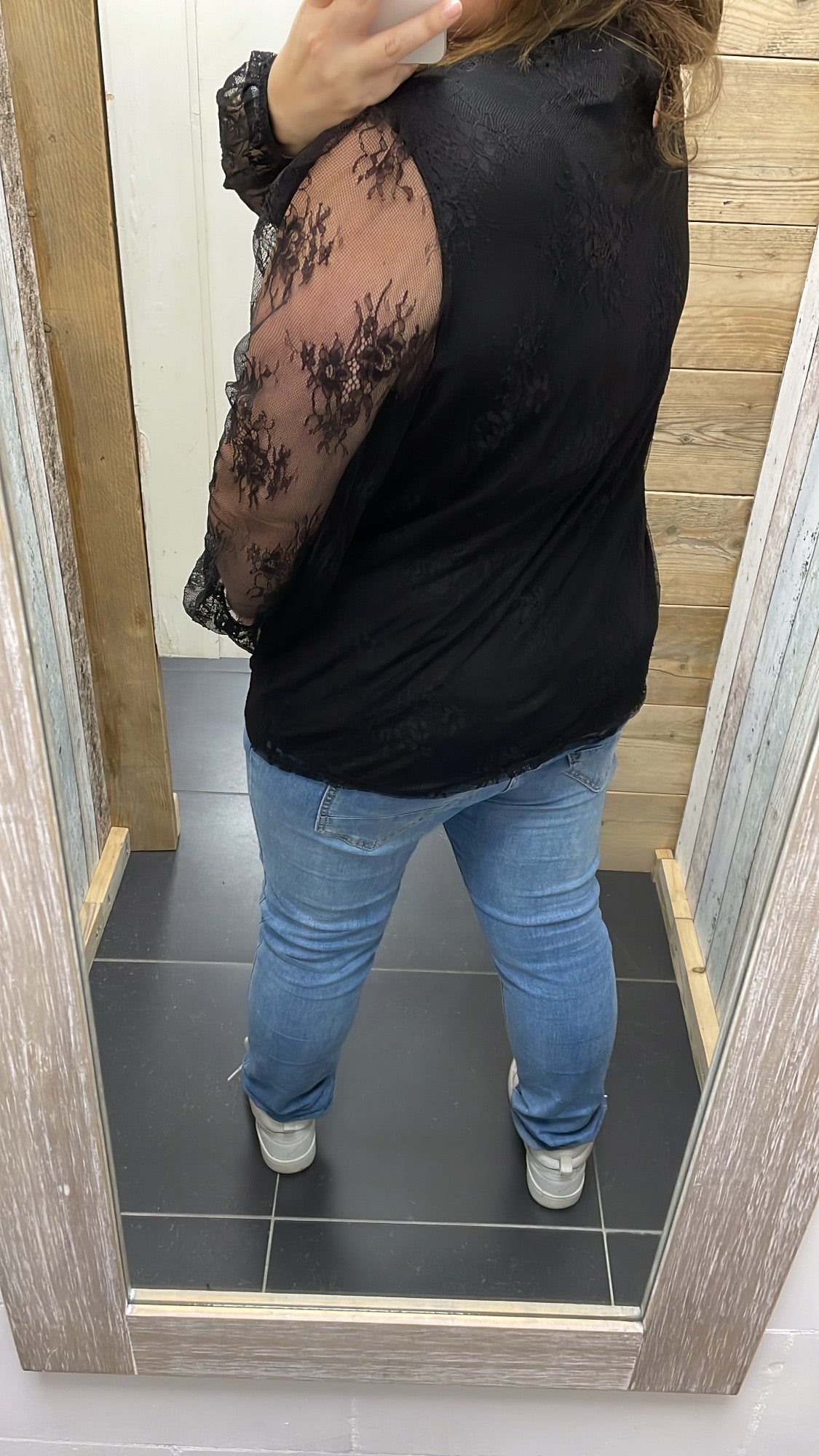 De mouwen zijn doorzichtig en hebben een bewerking van kant.