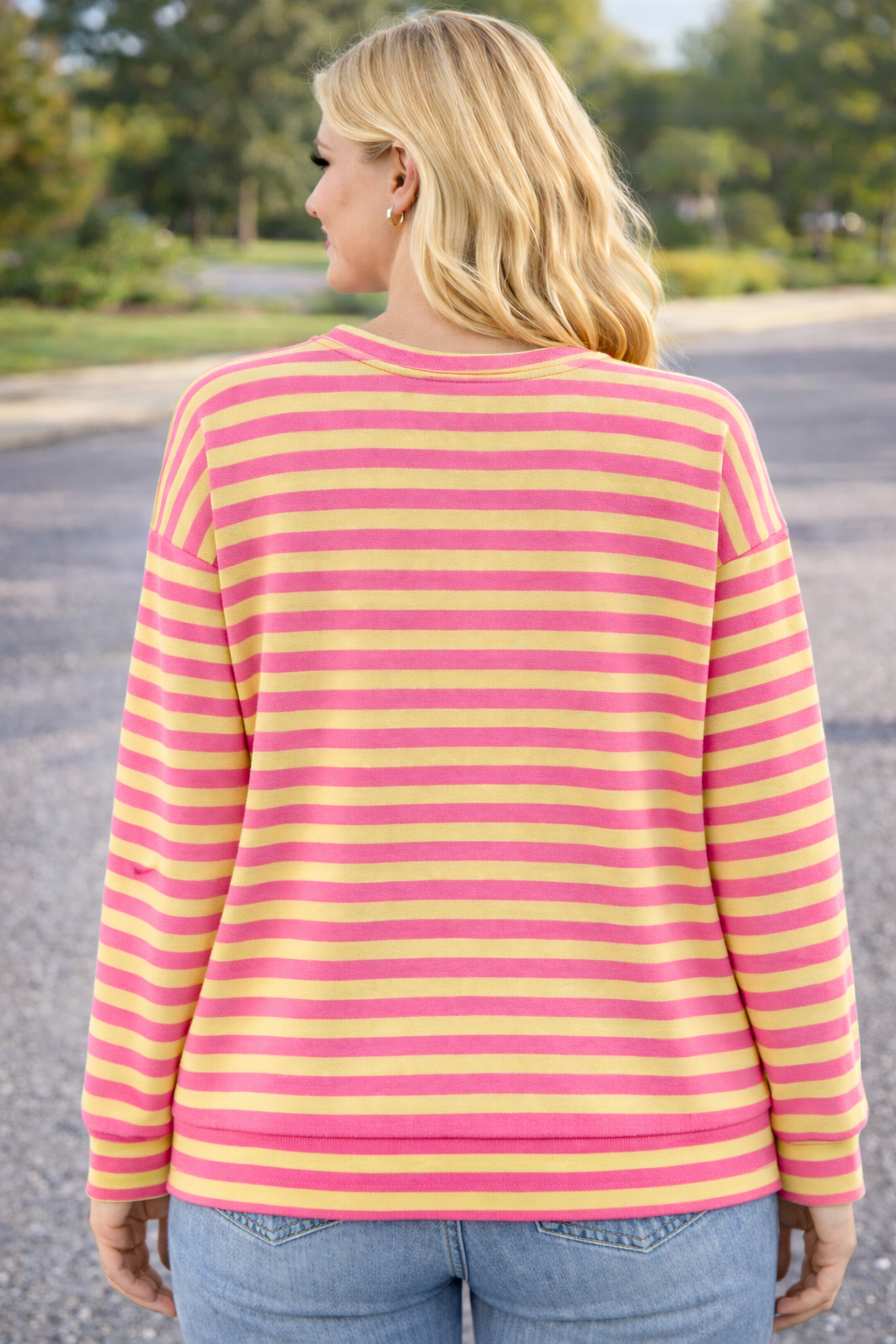 De trui is aan de achterkant langer dan aan de voorkant.