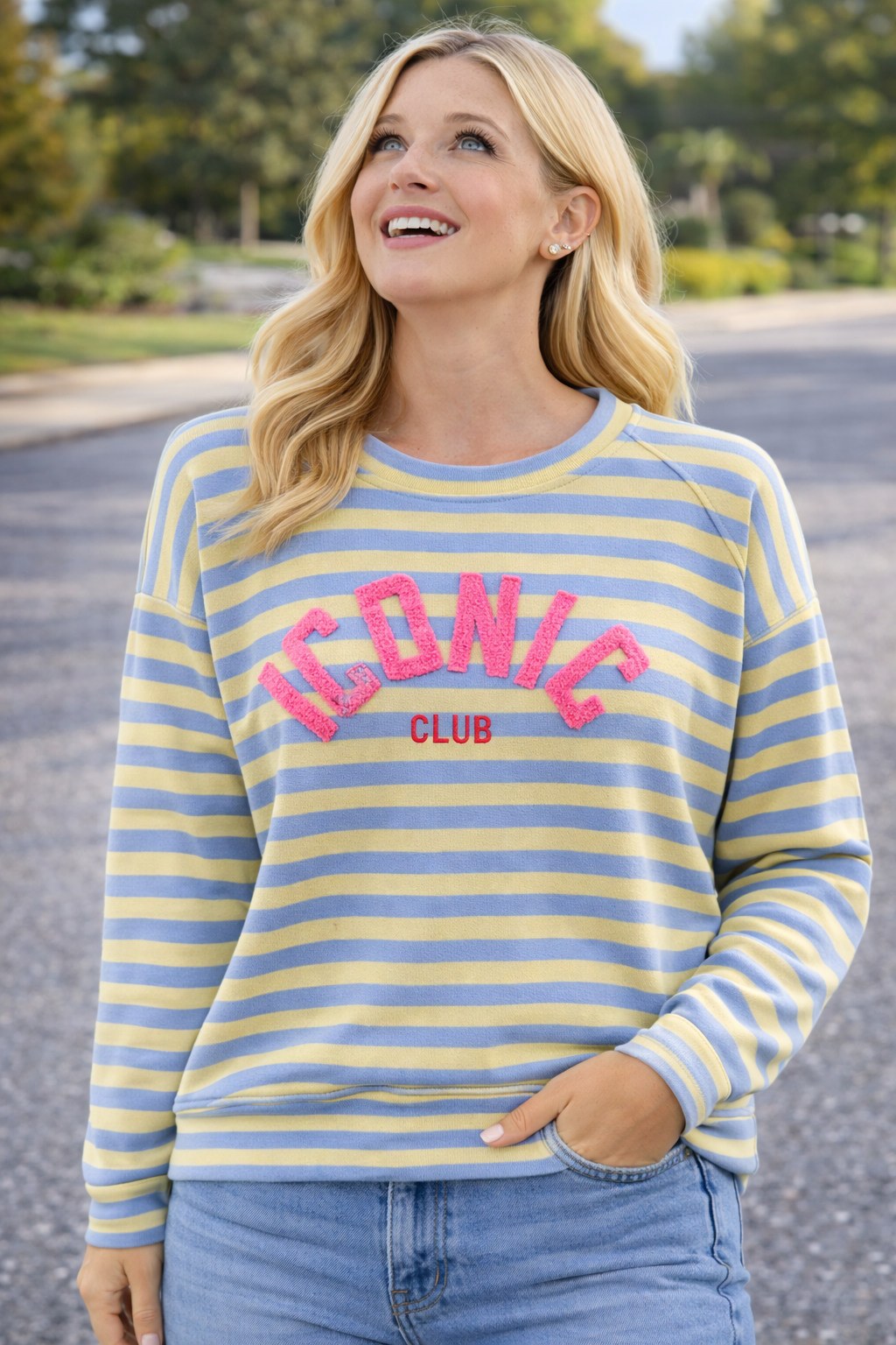 Op de voorkant staat de tekst 'ICONIC CLUB' in een teddystof.