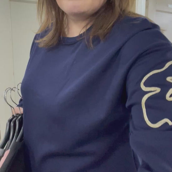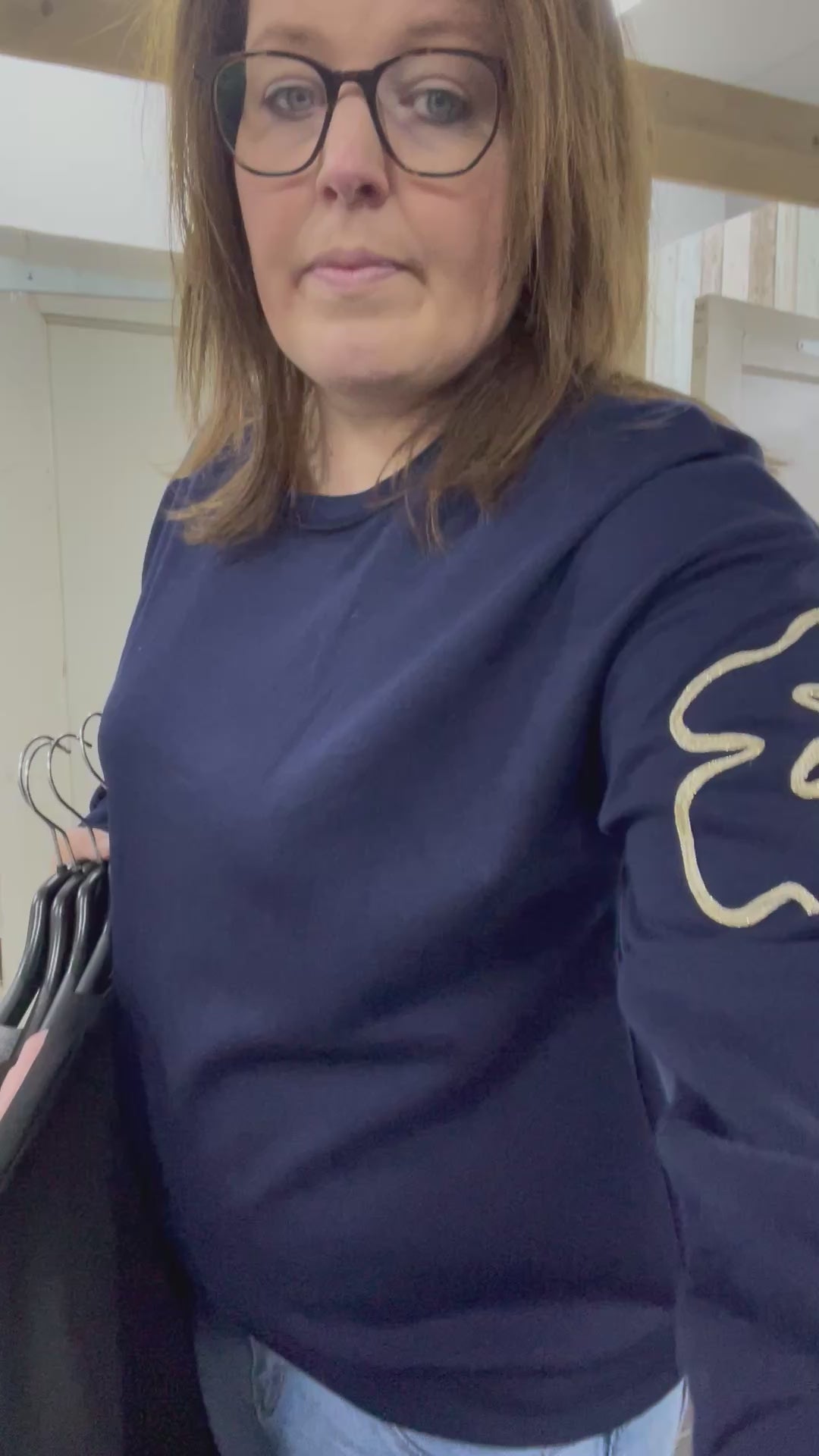 De trui heeft lange mouwen en op de mouw zit een koord gestikt.