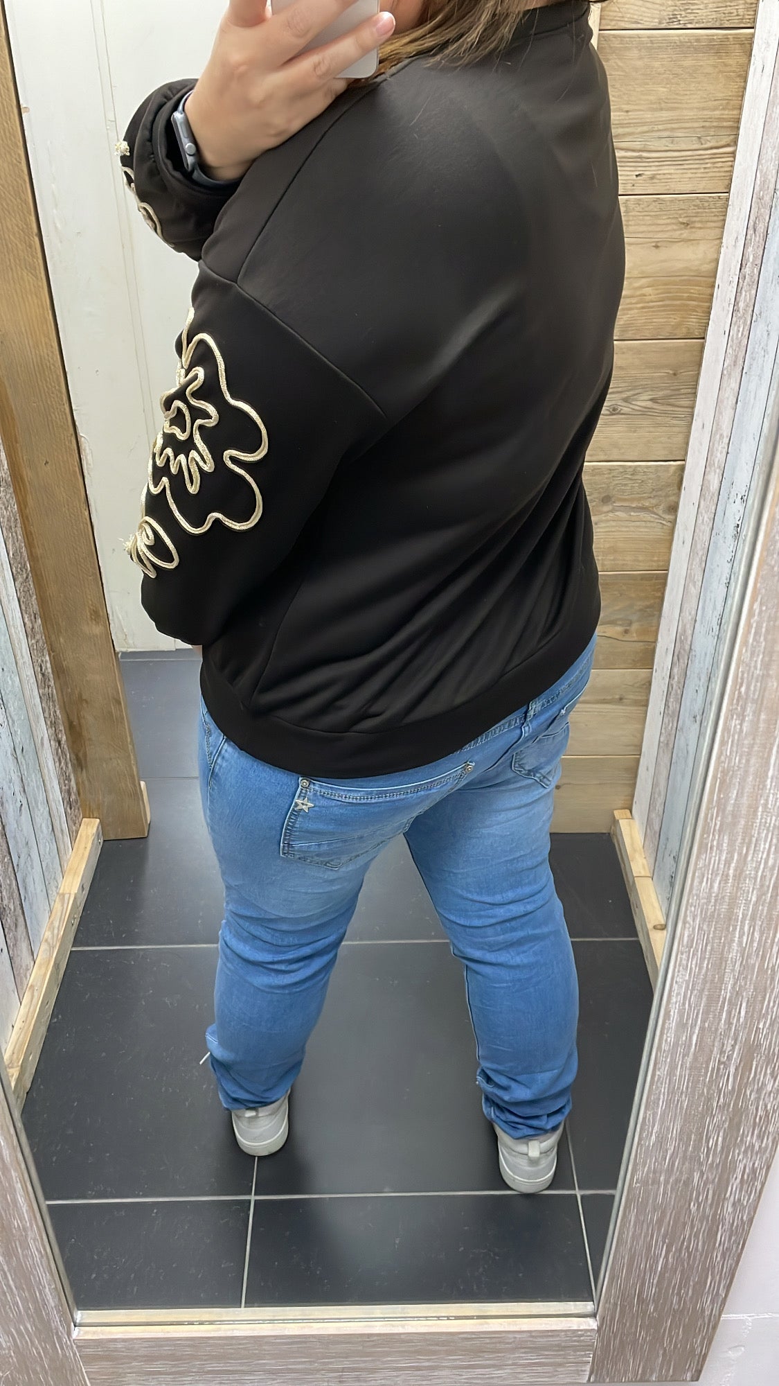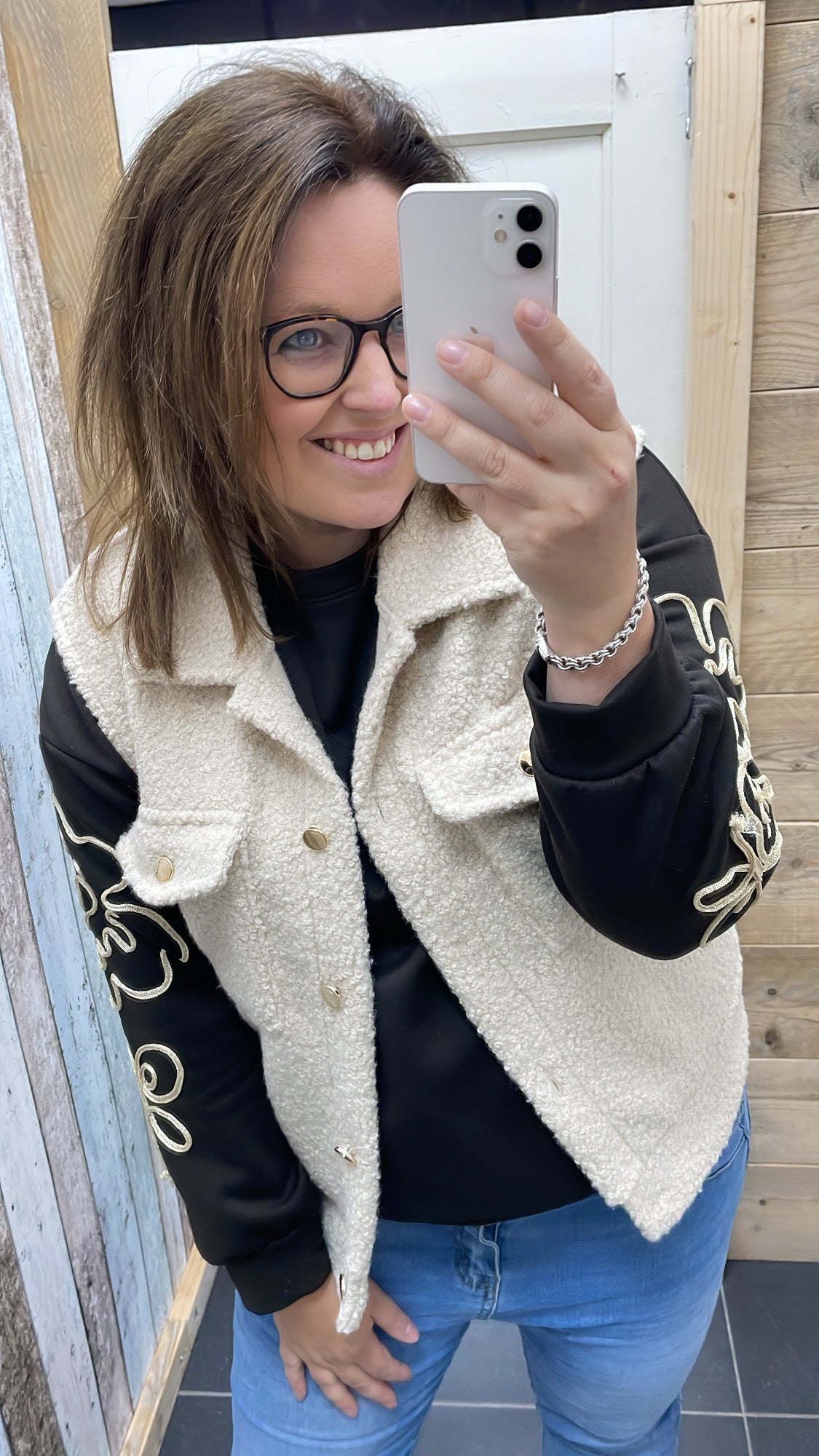 De trui heeft lange mouwen en op de mouw zit een koord gestikt.