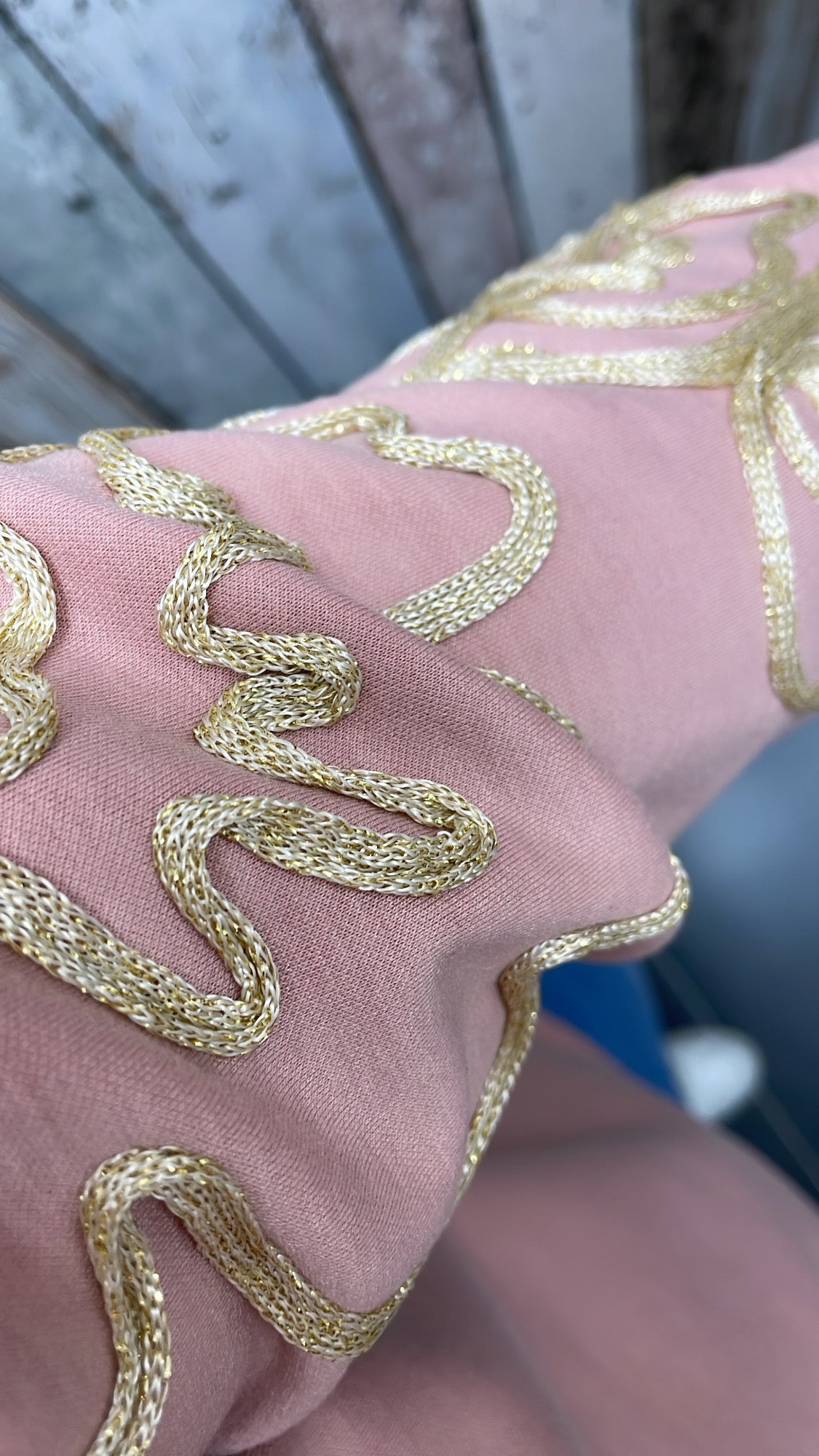 De trui heeft lange mouwen en op de mouw zit een koord gestikt.