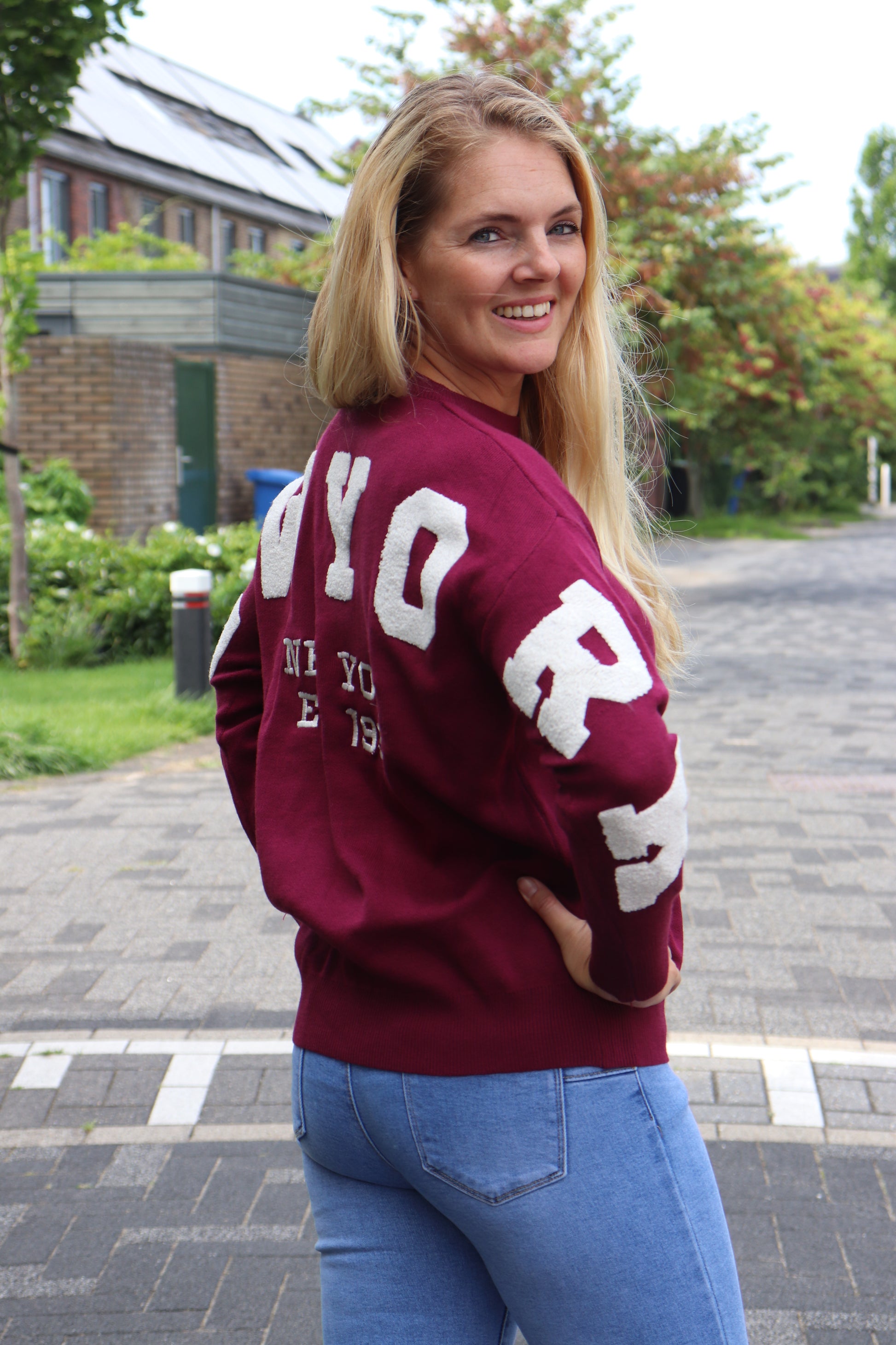Op de achterkant staat de tekst 'NEW YORK' deze loopt door over de mouwen.