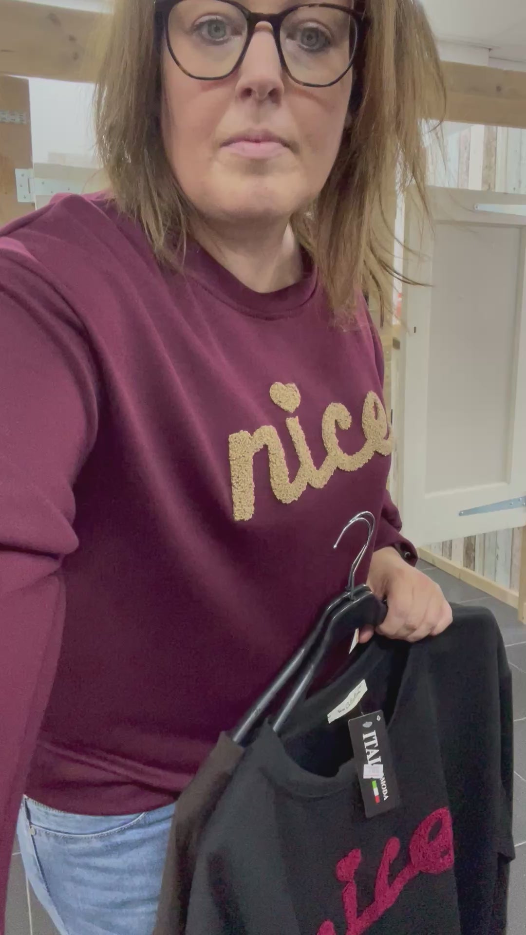 Hoe leuk is deze vrolijke trui met in een teddystof de tekst 'NICE'
