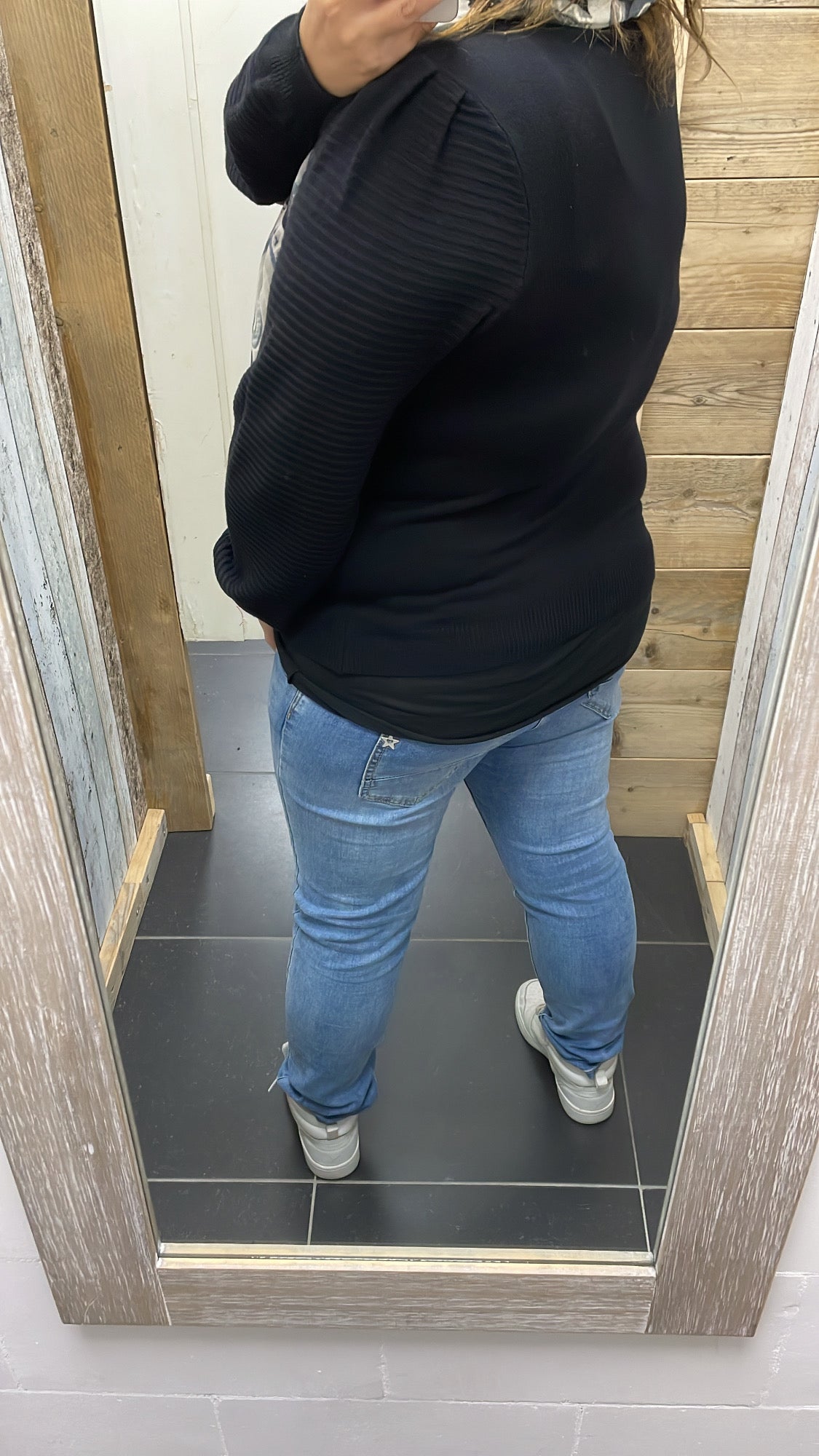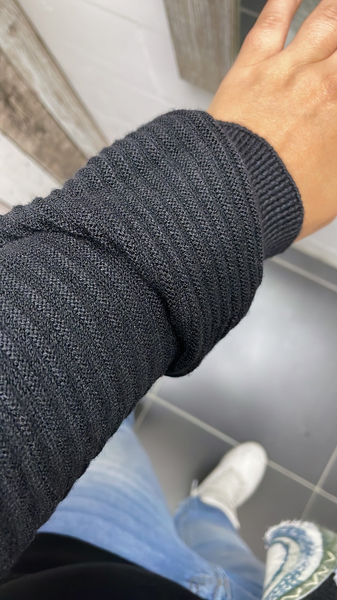 Op de mouw zit een ribbel patroon. De trui heeft een ronde hals.