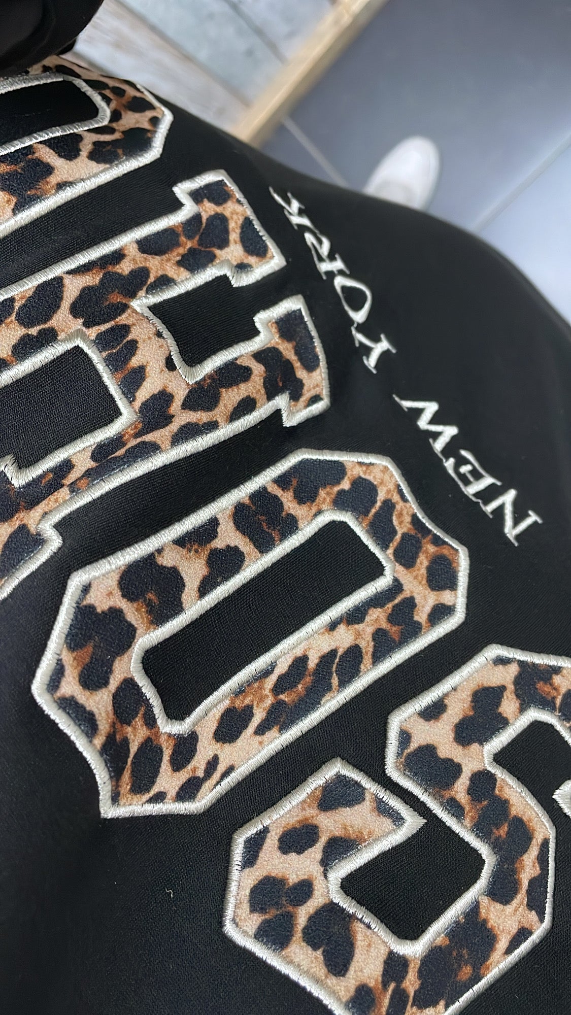 De tekst is geborduurd met in de tekst een panterprint dat gemaakt is van stof.
